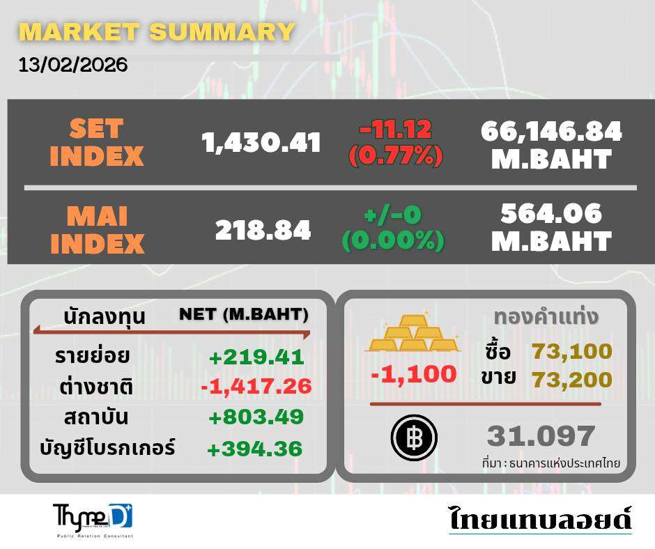 สรุปภาวะการลงทุนในตลาดหลักทรัพย์ ประจำวันที่ 13 กุมภาพันธ์ 2569