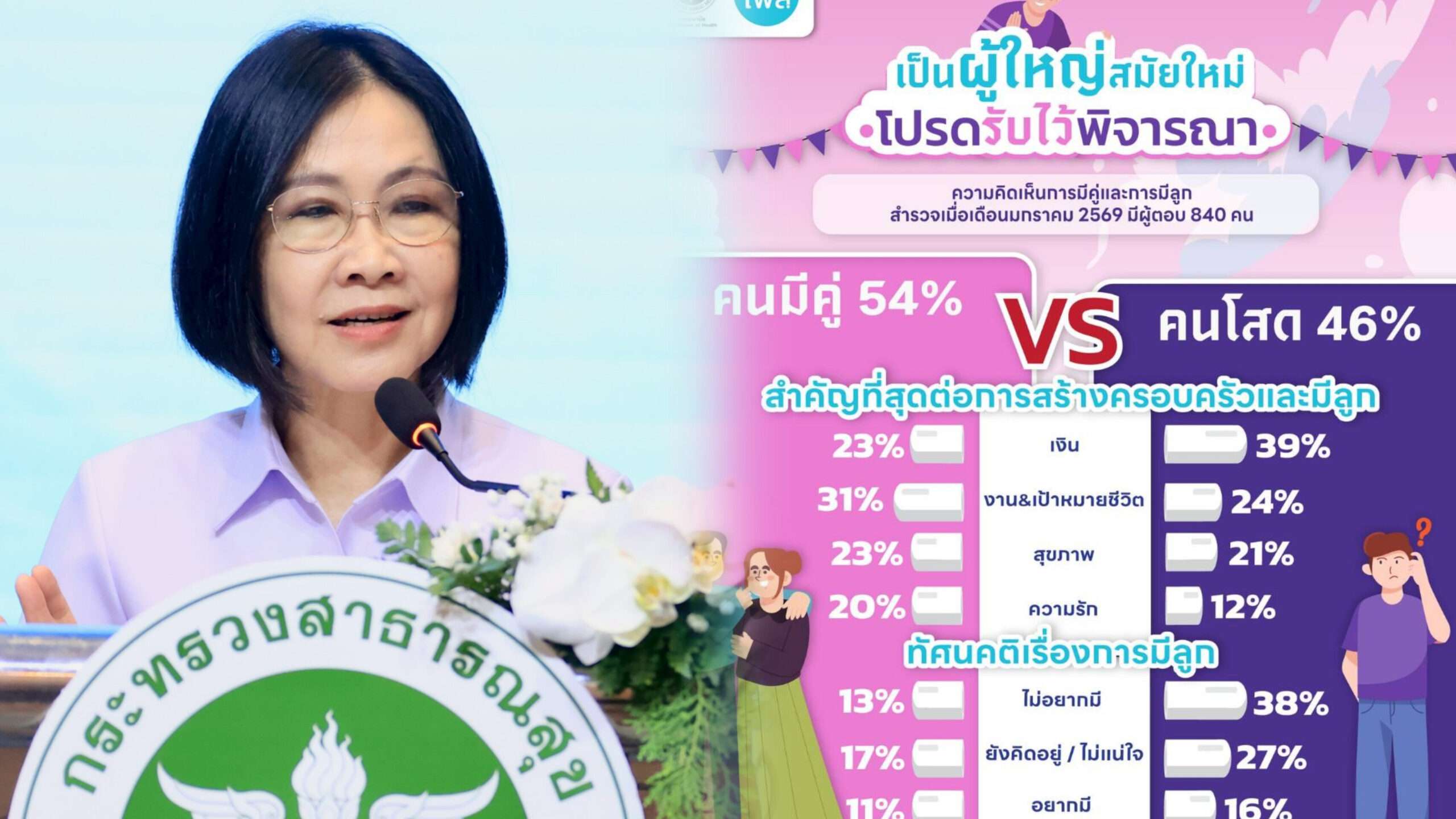 กรมอนามัย กระทรวงสาธารณสุข เผย ผลอนามัยโพลจากการสำรวจเรื่อง “การมีคู่และแนวคิดการมีลูกในยุคปัจจุบัน” จำนวน 840 คน พบว่า มีคนโสดถึงร้อยละ 39.4 และร้อยละ 23.8 ไม่ต้องการมีลูก เพราะให้ความสำคัญกับเรื่อง ความมั่นคงทางการเงิน งานและเป้าหมายชีวิต รวมถึงสุขภาพ