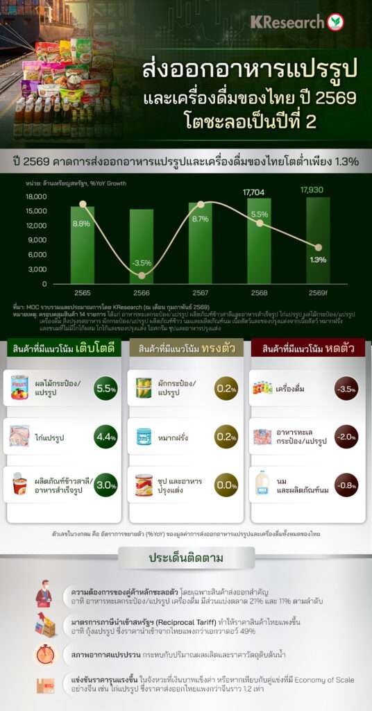 กรุงเทพฯ, วันที่ 15 ก.พ. – ศูนย์วิจัยกสิกรไทย ประเมินสถานการณ์ส่งออกอาหารแปรรูป และเครื่องดื่มของไทย ปี 2569 โดยคาดว่าอัตราการเติบโตจะชะลอเป็นปีที่ 2 หรือมีมูลค่าส่งออกราว 1.79 หมื่นล้านเหรียญสหรัฐฯ โตต่ำเพียง 1.3% เมื่อเทียบกับปีก่อน สำหรับสินค้าที่มีแนวโน้มเติบโตดี ได้แก่ ผลไม้กระป๋อง/แปรรูป ไก่แปรรูป ผลิตภัณฑ์ข้าวสาลีและอาหารสำเร็จรูป สินค้าที่มีแนวโน้มทรงตัว ได้แก่ ผักกระป๋อง/แปรรูป หมากฝรั่ง ซุปและของปรุงแต่ง ขณะที่สินค้าที่มีแนวโน้มหดตัว ได้แก่ เครื่องดื่ม อาหารทะเลกระป๋อง/แปรรูป นมและผลิตภัณฑ์นม