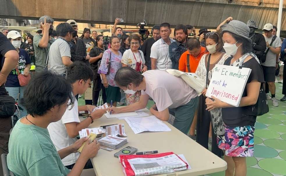 แนวร่วมธรรมศาสตร์ฯ ตั้งคูหาประชามติจำลอง กลางปทุมวัน จี้ “ถอดถอน กกต.” รับผิดชอบการเลือกตั้ง