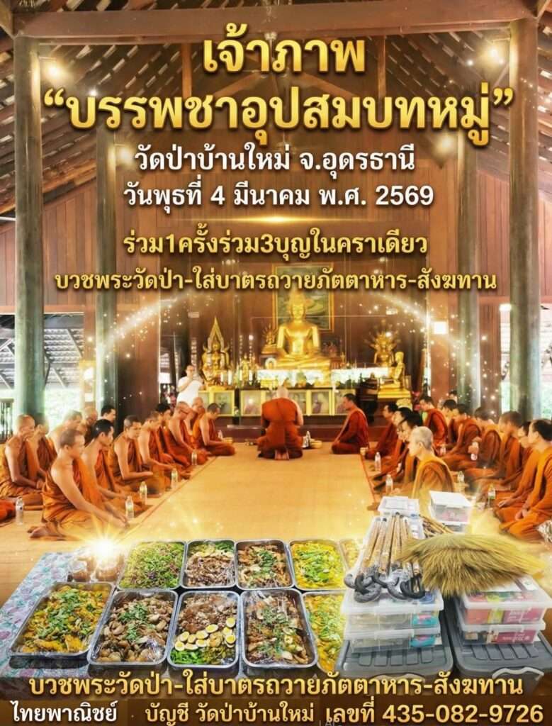 พิธีจัดขึ้นในวันพุธที่ 4 มีนาคม พ.ศ. 2569 ณ วัดป่าบ้านใหม่ จังหวัดอุดรธานี โดยเปิดรับเจ้าภาพร่วมบุญ ถึงเวลา 06.00 น. ของวันพิธี เท่านั้น 1 ครั้ง ได้ 3 บุญในคราเดียว. ผู้ร่วมบุญจะได้อานิสงส์ครบถ้วนทั้ง​ บุญบวชพระวัดป่าบุญใส่บาตรถวายภัตตาหาร บุญสังฆทานคำกล่าวที่ว่า“การบวชคนให้เป็นพระ คือการสืบต่ออายุพระพุทธศาสนาให้ยืนยาว”สะท้อนหัวใจของงานบุญครั้งนี้อย่างชัดเจน เพราะทุกบาททุกศรัทธา คือพลังสนับสนุนให้กุลบุตรผู้ตั้งใจ ได้เข้าสู่ร่มกาสาวพัสตร์ ศึกษาพระธรรมวินัยอย่างเต็มกำลัง