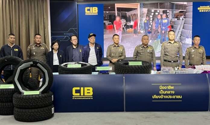 เมื่อเวลา 14.00 น. วันที่ 18 ก.พ. พล.ต.ท.กฤษฎา กาญจนอลงกรณ์ ผู้ช่วย ผบ.ตร. พร้อมด้วย พล.ต.ท.ณัฐศักดิ์ เชาวนาศัย ผบช.ก. พล.ต.ต.คงกฤช เลิศสิทธิกุล ผบก.ปคบ., พ.ต.อ.อนุวัฒน์ รักษ์เจริญ รอง ผบก.ปคบ. พ.ต.อ.ปิยะวัฒน์ ทองอุทัย ผกก.3 บก.ปคบ. นายเอกนิติ รมยานนท์ เลขาธิการสำนักงานมาตรฐานผลิตภัณฑ์อุตสาหกรรม ร่วมกันแถลงผลตรวจค้นโกดังเถื่อนลักลอบย้อมแมวยางเก่าหลอกลวงผู้บริโภค หลังนำกำลังเข้าตรวจสอบโกดังเก็บสินค้า 4 แห่งในพื้นที่ อ.ศรีราชา จ.ชลบุรี ก่อนสามารถตรวจยึดยางรถยนต์ไม่ได้มาตรฐานจำนวนกว่า 2 พันเส้น