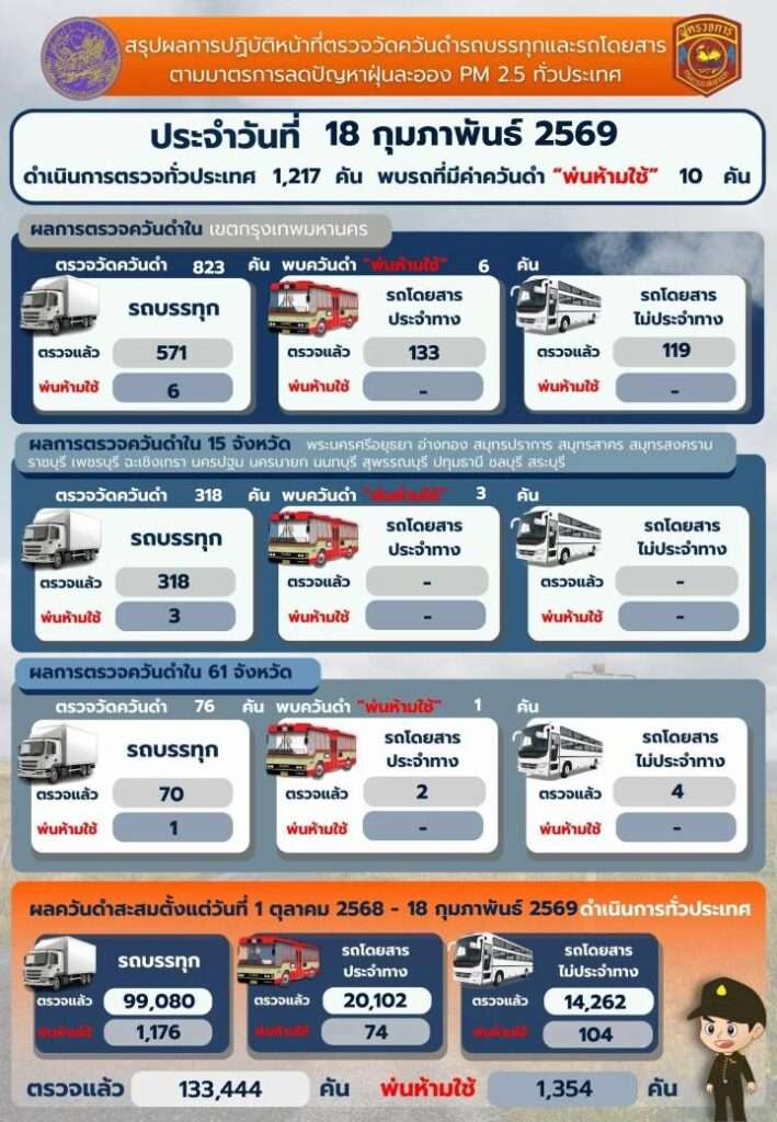 วันนี้ (18 กุมภาพันธ์ 2569) นายสรพงศ์ ไพฑูรย์พงษ์ อธิบดีกรมการขนส่งทางบก เผยผลการดำเนินการตรวจควันดำรถบรรทุกและรถโดยสารทั่วประเทศ ซึ่งเป็นการดำเนินการตามนโยบายของรัฐบาลและกระทรวงคมนาคม เพื่อป้องกันและแก้ไขปัญหาฝุ่นละอองขนาดเล็ก PM 2.5 โดยผลการตรวจวัดควันดำวันที่ 18 กุมภาพันธ์ 2569 มีผลการตรวจวัดควันดำรถโดยสารและรถบรรทุกทั่วประเทศ จำนวน 1,217 คัน พบรถที่มีค่าควันดำเกินเกณฑ์มาตรฐานที่ราชการกำหนดจำนวน 10 คัน ส่งผลให้ตั้งแต่วันที่ 1 ตุลาคม 2568 – 18 กุมภาพันธ์ 2569 ดำเนินการตรวจควันดำรถทั้งสิ้น 133,444 คัน พ่นห้ามใช้แล้วจำนวน 1,354 คัน