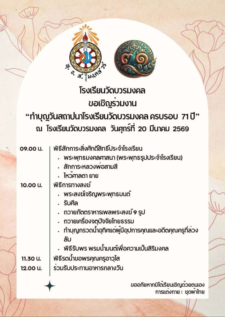 เมื่อวันที่ 20 กุมภาพันธ์ 2569 ผู้สื่อข่าวไทยแทบลอยด์ รายงานว่า โรงเรียนวัดบวรมงคล ขอเชิญศิษย์เก่า ผู้ปกครอง และพุทธศาสนิกชนร่วมงาน “ทำบุญวันสถาปนาโรงเรียนวัดบวรมงคล ครบรอบ 71 ปี” ในวันศุกร์ที่ 20 มีนาคม 2569 ณ โรงเรียนวัดบวรมงคล เพื่อร่วมสืบสานประเพณีอันดีงาม เสริมสิริมงคล และแสดงความกตัญญูกตเวทีต่อครูบาอาจารย์และผู้มีอุปการคุณ