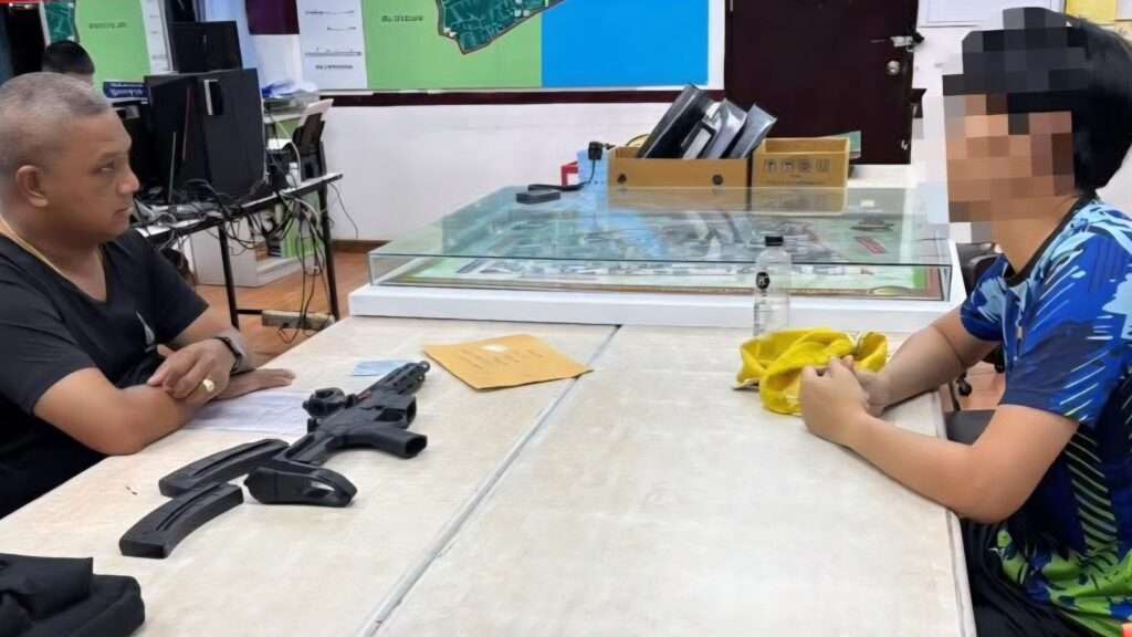 จากนั้นนายนพนทีฯ จึงได้ไปหยิบอาวุธปืน (ของกลางลำดับที่ 1) มาข่มขู่ผู้เสียหายอยู่ภายในบริเวณบ้าน ทำให้เกิดความกลัวว่าจะเกิดอันตรายแก่ตนและคนในชุมชน จึงต้องการให้เจ้าหน้าที่ตำรวจดำเนินการตามกฎหมาย จากนั้นจึงได้แสดงตนเป็นเจ้าหน้าที่ตำรวจ เพื่อขอตรวจสอบการรับอนุญาตให้มีอาวุธปืนจากนายนพนทีฯ ซึ่งนายนพนที ยินยอมให้เจ้าหน้าที่ตำรวจเข้าไปในบ้านเพื่อตรวจสอบอาวุธปืน ปรากว่านายนพนทีฯ ได้รับอนุญาตให้มีและใช้อาวุธปืน (แบบ ป.4) ตามใบอนุญาตเลขที่ ปค.182223/2564 ลงวันที่ 8 ตุลาคม 2564 จริง สาเหตุที่เอาอาวุธปืนออกมาถือเพื่อต้องการป้องกันตัวเกรงว่ากลุ่มผู้เสียหายจะทำร้ายตนเอง ในเบื้องต้นนายเจนกิจ แจ้งว่านายนพนทีฯ เคยมีเรื่องกับตนและเคยแจ้งความไว้แล้ว และกลุ่มผู้เสียหายทุกคนยืนยันให้เจ้าหน้าที่ตำรวจดำเนินคดี ประกอบกับเกรงว่านายนพนทีฯ จะเอาอาวุธปืนมาก่อเหตุร้ายเกิดขึ้นได้ จึงได้แจ้งข้อกล่าวให้ทราบ แจ้งสิทธิ์ตามกฎหมายให้ทราบ นำตัวพร้อมอาวุธปืนของกลาง นำส่งพนักงานสอบสวนเพื่อดำเนินคดี