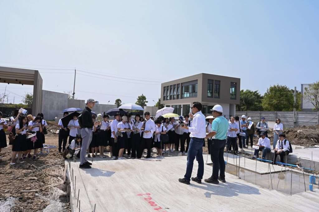 การเปิดไซต์ก่อสร้างจริงในครั้งนี้จึงเป็นมากกว่าการเยี่ยมชมทั่วไป แต่เป็นการเชื่อมโยงองค์ความรู้จากห้องเรียนสู่ประสบการณ์ภาคสนาม ให้นิสิตได้เห็นภาพกระบวนการทำงานจริง เข้าใจรายละเอียดเชิงโครงสร้างและวัสดุ รวมถึงการบูรณาการเทคโนโลยีพลังงานสะอาดเข้ากับงานสถาปัตยกรรมอย่างเป็นรูปธรรม ซึ่งสอดคล้องกับทิศทางการพัฒนาอสังหาริมทรัพย์ยุคใหม่ที่ต้องคำนึงถึงผู้อยู่อาศัย สิ่งแวดล้อม และการใช้พลังงานอย่างมีประสิทธิภาพควบคู่กัน