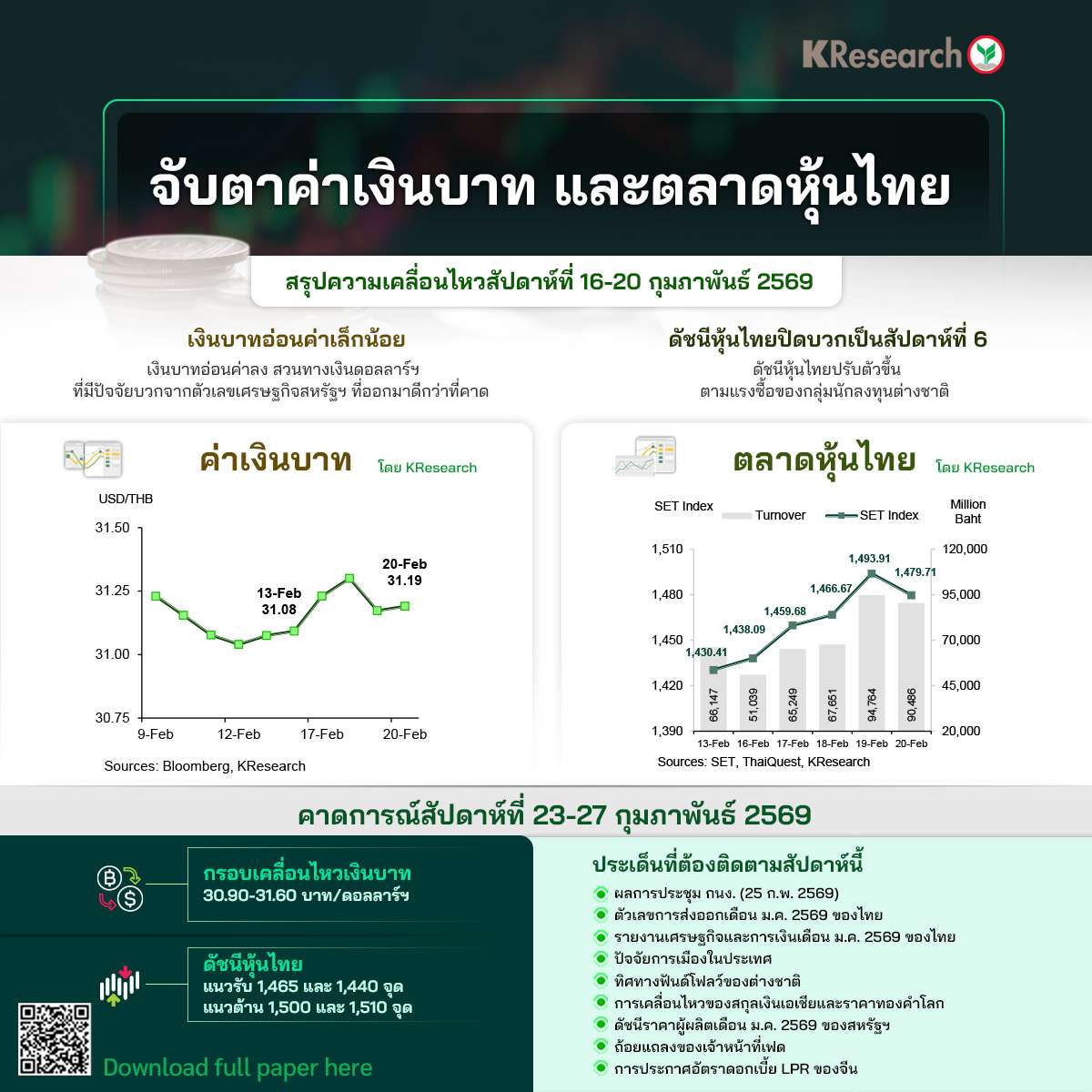 โดยสัปดาห์หน้า (23-27 ก.พ.) ศูนย์วิจัยกสิกรคาดกรอบการเคลื่อนไหวของเงินบาทที่ 30.90-31.60 บาท/ดอลลาร์ฯ ส่วนดัชนีหุ้นไทย แนวรับที่ 1,465 และ 1,440 จุด แนวต้านที่ 1,500 และ 1,510 จุด