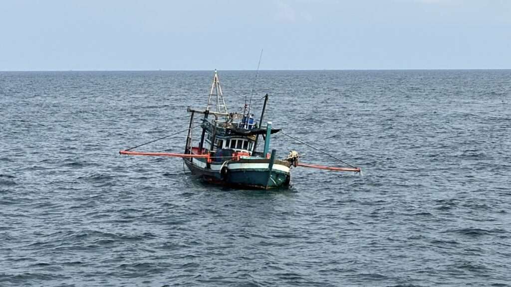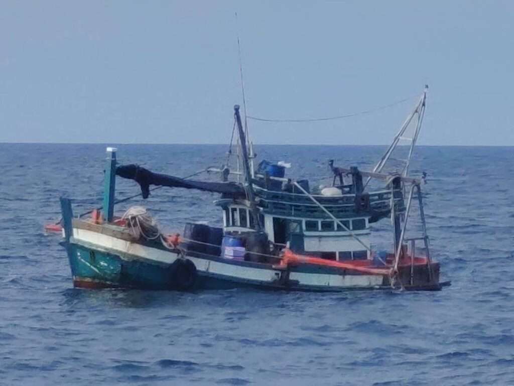 จากการระบุพิกัดโดยเครื่องมืออิเล็กทรอนิกส์พบว่ารุกล้ำเข้ามาจากเส้นเขตแดนทางทะเลไทย–กัมพูชา ประมาณ 1 ไมล์ทะเลเจ้าหน้าที่จึงได้แสดงตัวเข้าทำการตรวจค้นและจับกุม โดยอาศัยอำนาจตามมาตรา 4 แห่งพระราชบัญญัติให้อำนาจเจ้าหน้าที่ทหารเรือปราบปรามการกระทำความผิดบางอย่างทางทะเล พ.ศ. 2490 จากการตรวจสอบเบื้องต้นพบว่า เรือไม่มีชื่อและไม่มีสัญชาติ ไม่พบเอกสารประจำเรือและเอกสารประจำตัวลูกเรือ