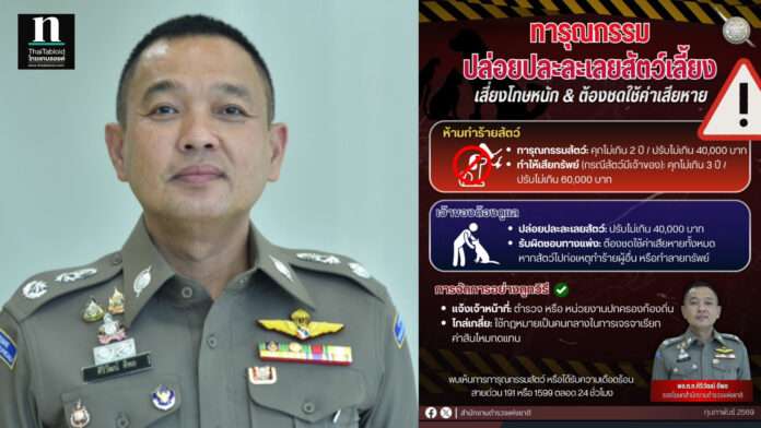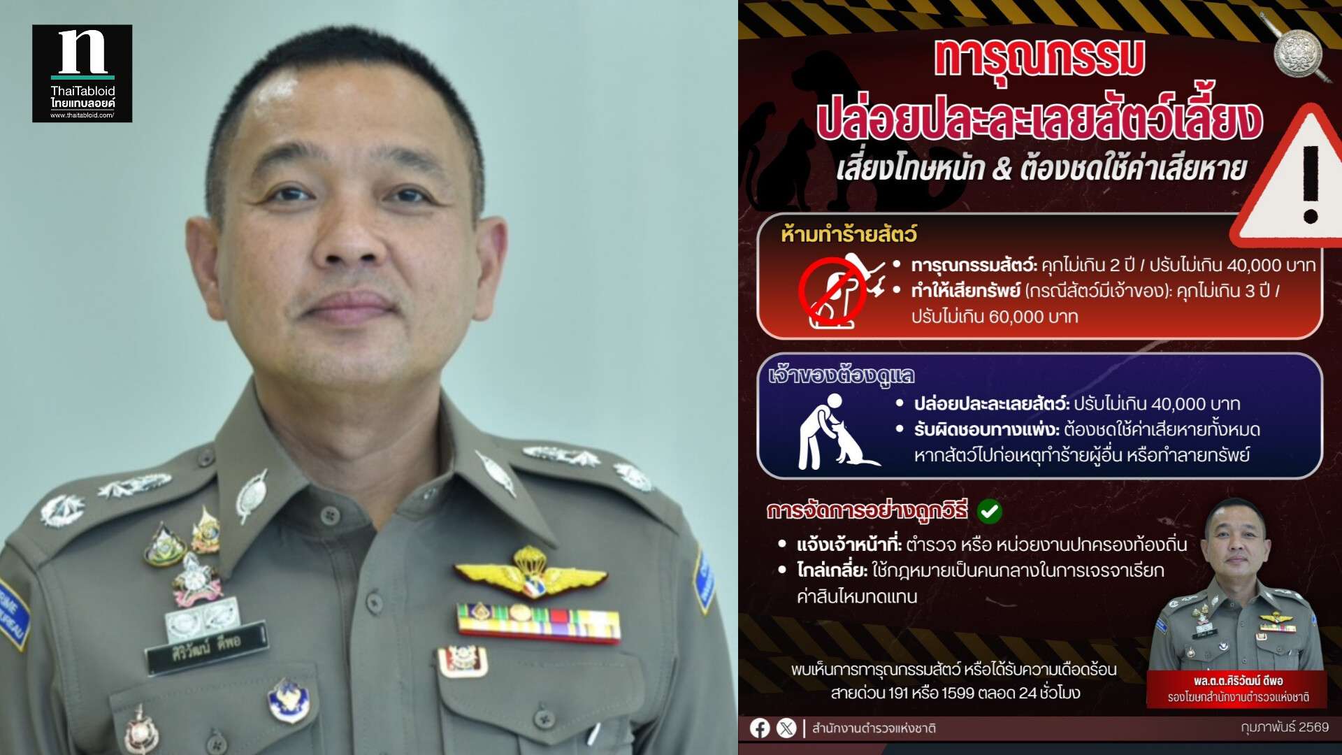 วันนี้ (24 กุมภาพันธ์ 2569) พล.ต.ต.ศิริวัฒน์ ดีพอ รองโฆษกสำนักงานตำรวจแห่งชาติ เปิดเผยว่า พล.ต.อ.กิตติ์รัฐ พันธุ์เพ็ชร์ ผู้บัญชาการตำรวจแห่งชาติ มีความห่วงใยพี่น้องประชาชนจากปัญหาความขัดแย้งระหว่างเพื่อนบ้านอันเกิดจากสัตว์เลี้ยงหลุดไปสร้างความเดือดร้อน จนนำไปสู่การใช้ความรุนแรงทารุณกรรมสัตว์ซึ่งเป็นความผิดทางอาญา