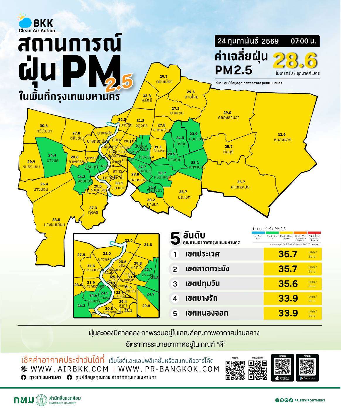ศูนย์ข้อมูลคุณภาพอากาศกรุงเทพมหานคร สรุปผลการตรวจวัดค่าฝุ่นละอองขนาดไม่เกิน 2.5 ไมครอน (PM2.5) ประจำวันอังคารที่ 24 กุมภาพันธ์ 2569 ช่วงเวลา 05.00–07.00 น. (3 ชั่วโมงล่าสุด) พบค่าฝุ่นอยู่ระหว่าง 19.9–36.3 ไมโครกรัมต่อลูกบาศก์เมตร ขณะที่ค่าเฉลี่ยของ กรุงเทพมหานคร อยู่ที่ 27.2 ไมโครกรัมต่อลูกบาศก์เมตร ซึ่งไม่เกินค่ามาตรฐานที่กำหนดไว้ไม่เกิน 37.5 ไมโครกรัมต่อลูกบาศก์เมตร