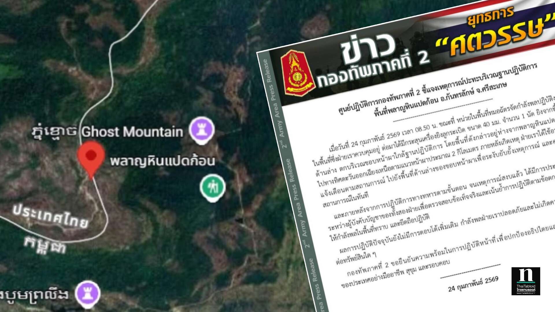 กองทัพภาคที่ 2 ชี้แจงเหตุปะทะบริเวณฐานปฏิบัติการพื้นที่พลาญหินแปดก้อน อ.กันทรลักษ์ จ.ศรีสะเกษ หลังมีกระสุนเครื่องยิงลูกระเบิดขนาด 40 มม. ยิงจากพื้นที่ด้านล่างตกใกล้ฐานปฏิบัติการ ฝ่ายไทยใช้อาวุธยิงแจ้งเตือนตามขั้นตอน ควบคุมสถานการณ์ได้โดยเร็ว ไม่พบการตอบโต้เพิ่มเติม กำลังพลปลอดภัย ไม่มีความเสียหาย ย้ำพร้อมปกป้องอธิปไตยอย่างสุขุมและรอบคอบ