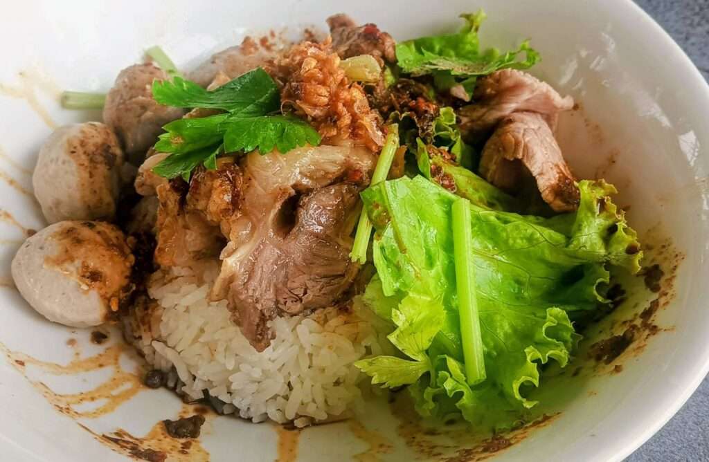 เมนูที่ 2 ข้าวแห้งเนื้อรวม ราคา 60 บาท ข้าวสวยโปะหน้าด้วยเนื้อรวม ทำเหมือนก๋วยเตี๋ยวแห้ง ดูแปลกตา แต่รสชาติดี เหมือนกินเกาเหลาแห้งกับข้าว