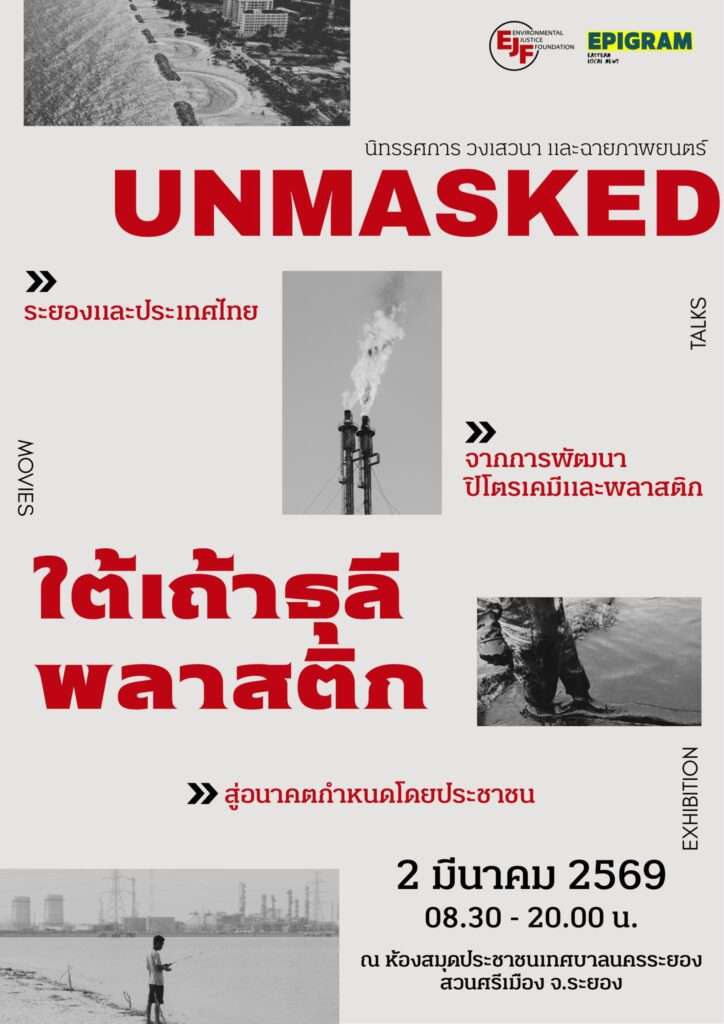 ระยอง, วันที่ 25 ก.พ. – มูลนิธิความยุติธรรมเชิงสิ่งแวดล้อม (EJF) และ EPIGRAM ขอเชิญทุกคนมาร่วมงานฉายสารคดี “UNMASKED: ใต้เถ้าธุลีพลาสติก” นิทรรศการ และวงเสวนา “ระยองและประเทศไทย: จากการพัฒนาปิโตรเคมีและพลาสติก สู่อนาคตกำหนดโดยประชาชน” ในวันที่ 2 มีนาคม 2569 เวลา 08.30 น. – 12.00 น. ที่ห้อง Koh Kaew 1 โรงแรม Classic Kameo อำเภอเมือง จังหวัดระยอง