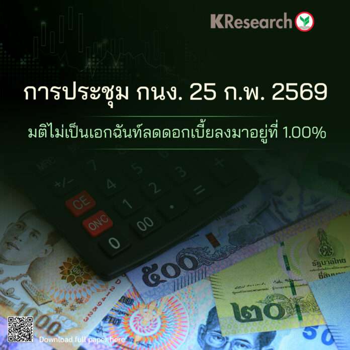 กรุงเทพฯ, วันที่ 25 ก.พ. – ที่ประชุมคณะกรรมการนโยบายการเงิน (กนง.) มีมติไม่เป็นเอกฉันท์ 4 ต่อ 2 เสียงปรับลดดอกเบี้ยนโยบาย 0.25% ลงมาอยู่ที่ 1.00% เพื่อสนับสนุนการฟื้นตัวของเศรษฐกิจและบรรเทาภาระหนี้เพิ่มเติม สวนทางที่ตลาดคาด ขณะที่ 2 เสียงเห็นควรให้คงดอกเบี้ยนโยบายที่ 1.25% ซึ่งผลการประชุมสะท้อนการให้น้ำหนักต่อการประคับประคองและสนับสนุนการฟื้นตัวของเศรษฐกิจไทยมากขึ้น พร้อมทั้งเร่งจังหวะการลดดอกเบี้ยในลักษณะ front-load ท่ามกลางการส่งผ่านนโยบายการเงินที่มีระยะเวลาล่าช้า (lag time)