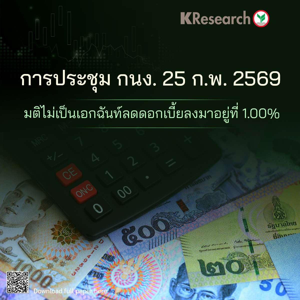 ศูนย์วิจัยกสิกรไทย ประเมินว่า กนง. อาจยุติการปรับลดอัตราดอกเบี้ยและเข้าสู่โหมด wait-and-see เพื่อรอติดตามพัฒนาการของเศรษฐกิจไทยในระยะถัดไป โดยมองว่าอัตราดอกเบี้ยนโยบายที่ระดับ 1.00% ถือว่าเหมาะสมกับแนวโน้มเศรษฐกิจและเงินเฟ้อในปัจจุบัน อย่างไรก็ดี หากเศรษฐกิจไทยออกมาอ่อนแอกว่าที่คาด โอกาสที่กนง. จะพิจารณาปรับลดดอกเบี้ยเพิ่มเติมยังคงมีอยู่