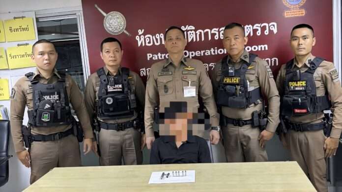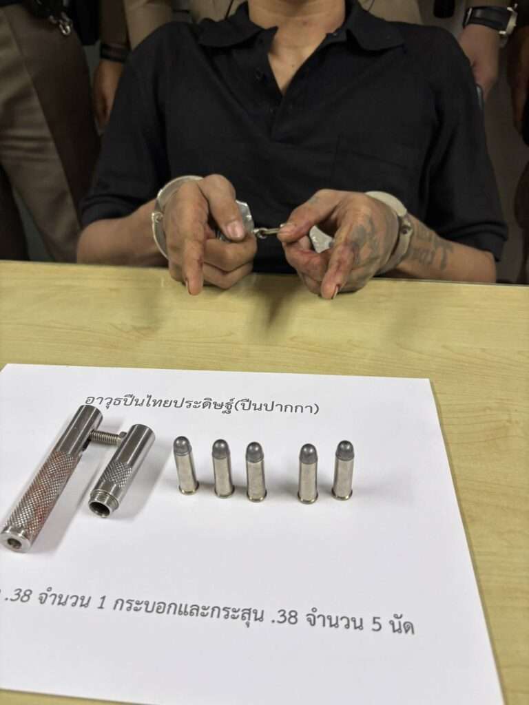 โดยมีของกลาง อาวุธปืนไทยประดิษฐ์ (ปืนปากกา) จำนวน 1 กระบอก กระสุนปืนขนาด .38 จำนวน 5 นัด กระเป๋าสะพายข้างสีดำ จำนวน 1 ใบ