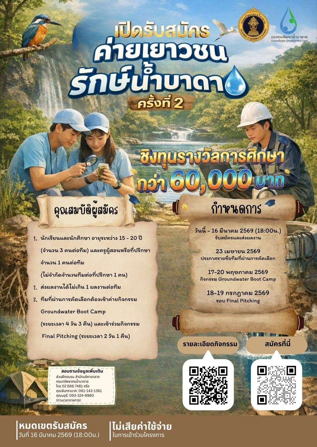 กรุงเทพฯ, วันที่ 26 ก.พ. – กรมทรัพยากรน้ำบาดาล กระทรวงทรัพยากรธรรมชาติและสิ่งแวดล้อม ขอเชิญชวนนักเรียน นักศึกษาทั่วประเทศ สมัครเข้าร่วมค่ายเยาวชนรักษ์น้ำบาดาล ครั้งที่ 2 (Youth Groundwater Guardian) “Our Aquifer, Our Future บาดาลเล่าเรื่อง” ใน Theme “น้ำบาดาลหัวใจของการดำรงชีวิตและเศรษฐกิจไทย” ซึ่งเป็นกิจกรรมที่เปิดโอกาสให้วัยรุ่น Gen Z อายุระหว่าง 15 – 20 ปี ใช้พลังแห่งความคิดสร้างสรรค์เพื่อบอกเล่าและถ่ายทอดเรื่องราวเกี่ยวกับน้ำบาดาล พร้อมชิงทุนการศึกษาและเกียรติบัตร รวมมูลค่ากว่า 60,000 บาท
