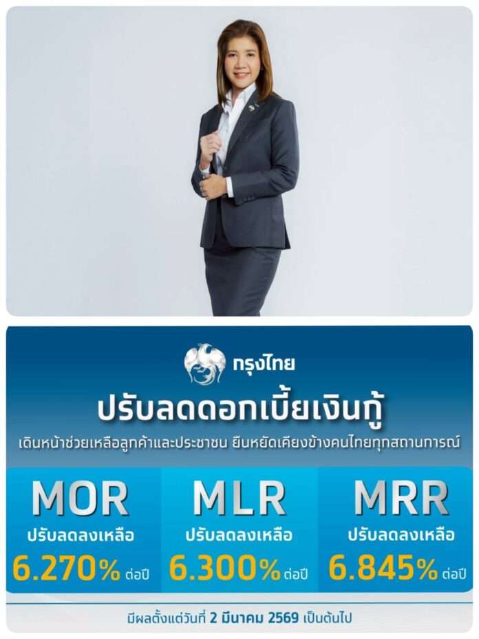 นางสาวศรัณยา เวชากุล ประธานผู้บริหาร Financial, Strategy & Resources Management ธนาคารกรุงไทย เปิดเผยว่า จากภาวะเศรษฐกิจที่มีแนวโน้มขยายตัวต่ำกว่าศักยภาพ จากความท้าทายรอบด้านและปัจจัยเชิงโครงสร้าง ทั้งเศรษฐกิจนอกระบบมีขนาดใหญ่ หนี้ครัวเรือนอยู่ในระดับสูง กระทบต่อขีดความสามารถทางการแข่งขันของภาคธุรกิจ และการดำรงชีพของภาคครัวเรือน ธนาคารจึงปรับลดอัตราดอกเบี้ยเงินกู้ สำหรับลูกค้ารายใหญ่ชั้นดี ประเภทเงินเบิกเกินบัญชี (MOR) เหลือ 6.270%ต่อปี อัตราดอกเบี้ยเงินกู้ลูกค้ารายใหญ่ชั้นดี ประเภทเงินกู้แบบมีระยะเวลา (MLR) เหลือ 6.300%ต่อปี และอัตราดอกเบี้ยสำหรับลูกค้ารายย่อยชั้นดี (MRR) เหลือ 6.845%ต่อปี มีผลตั้งแต่วันที่ 2 มีนาคม 2569 เป็นต้นไป เพื่อช่วยบรรเทาภาระหนี้ ลดค่าใช้จ่ายทางการเงินให้แก่ลูกค้าประชาชน โดยเฉพาะครัวเรือนกลุ่มเปราะบาง และผู้ประกอบการ SME ประคองการจ้างงาน สอดคล้องกับนโยบายของคณะกรรมการนโยบายการเงิน (กนง.) ในการสนับสนุนการฟื้นตัวของเศรษฐกิจในระยะข้างหน้า