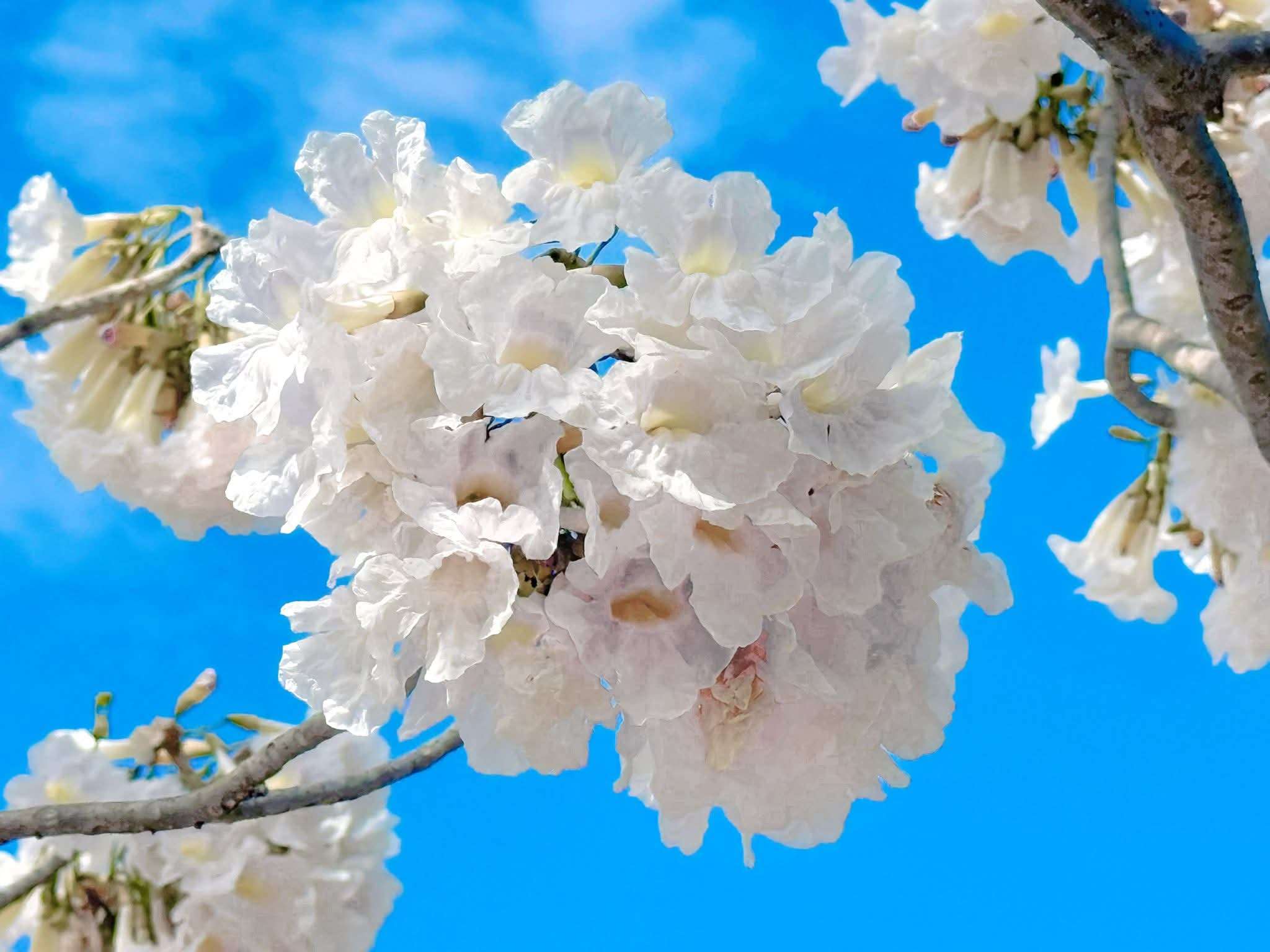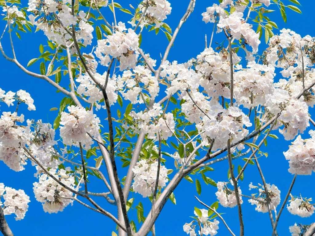 แม้โดยทั่วไปจะพบเฉดชมพูอ่อน ชมพูสด และขาว แต่ในช่วงที่ดอกสีขาวบานสะพรั่งพร้อมกันทั้งต้น ภาพที่เห็นชวนให้นึกถึงปุยเมฆหรือหิมะบางเบาเหนือเมืองร้อน ความขาวสะอาดตาตัดกับท้องฟ้าคราม กลายเป็นความงามที่เรียบง่ายแต่ตราตรึง