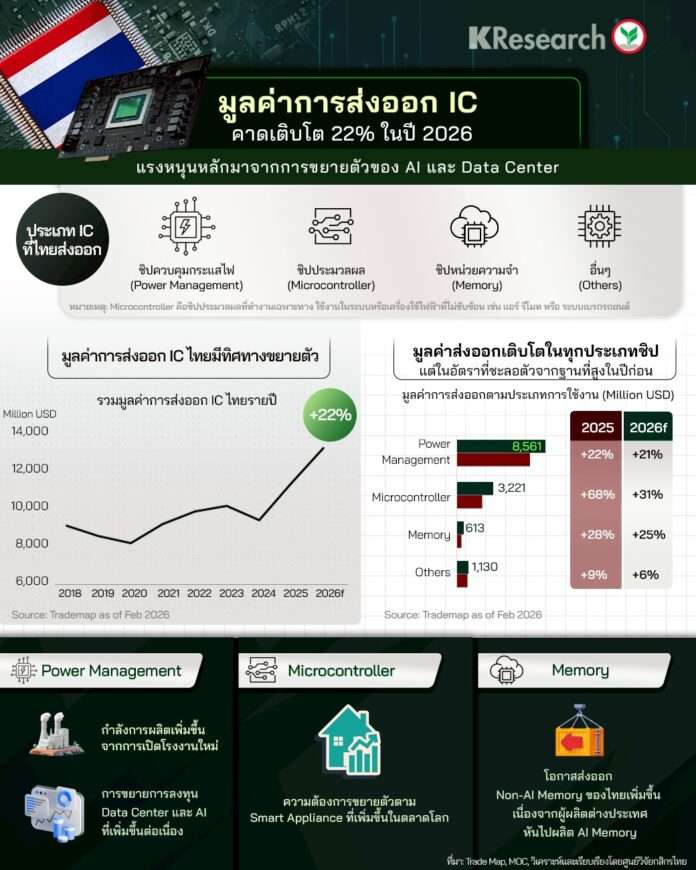 กรุงเทพฯ, วันที่ 27 ก.พ. – ศูนย์วิจัยกสิกรไทย คาดการณ์มูลค่าการส่งออกแผงวงจรรวม (IC) ของไทย เติบโต 22% จากแรงหนุนการลงทุนด้าน AI และ Data Center ทั่วโลก แม้ไทยไม่ได้ผลิตชิป AI ขั้นสูงโดยตรง แต่ความต้องการชิปทั่วไปในห่วงโซ่อุปทานที่เพิ่มขึ้นยังสนับสนุนให้การส่งออกเติบโตต่อเนื่อง โดยมูลค่าการส่งออกขยายตัวในทุกกลุ่มชิป แม้อัตราการเติบโตจะชะลอลงจากฐานที่สูงในปีก่อนหน้า