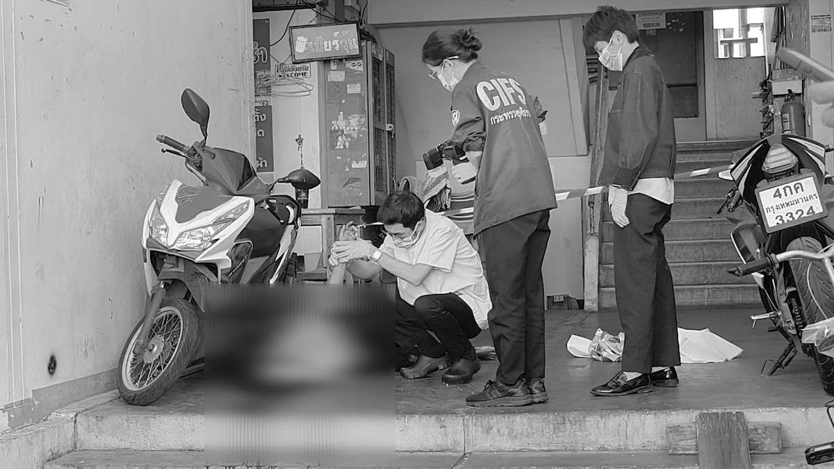 ที่เกิดเหตุบริเวณทางเข้าอาคาร ชั้น 1 พบร่างผู้เสียชีวิต ทราบชื่อคือ น.ส.เอ(นามสมมุติ)อายุ 52 ปี สภาพ ไม่สวมเสื้อ ใส่กางเกงสามส่วนตัวเดียว สภาพศพพบบาดแผลบริเวณศีรษะ คาดเกิดจากแรงกระแทก นอนคว่ำหน้าเสียชีวิตจมกองเลือด บริเวณพื้นที่ส่วนกลางชั้น 5 พบเก้าอี้สำนักงานสีดำตั้งอยู่ริมระเบียง มีรอยเท้าเปื้อนอยู่ คาดว่าเป็นของผู้เสียชีวิต เบื้องต้นทราบว่าผู้เสียชีวิตเป็นผู้ป่วบจิตเวช รักษาตัวอยู่ที่โรงพยาบาลศรีธัญญา