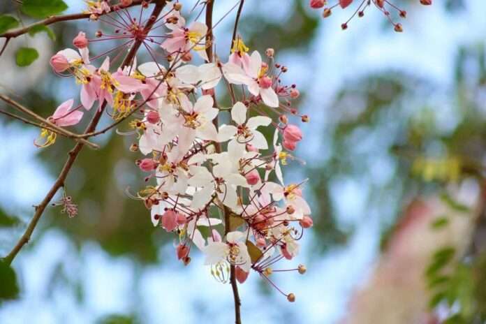 กัลปพฤกษ์เป็นไม้ยืนต้นขนาดกลาง ผลัดใบก่อนออกดอกในช่วงเดือนกุมภาพันธ์ถึงเมษายน ช่อดอกสีชมพูอ่อนจะค่อยๆ เปลี่ยนเป็นสีขาวก่อนร่วงโรยอย่างอ่อนหวาน วงจรสั้นๆ ของดอกไม้เหล่านี้ กลับทิ้งความประทับใจยาวนานในความทรงจำของผู้พบเห็น