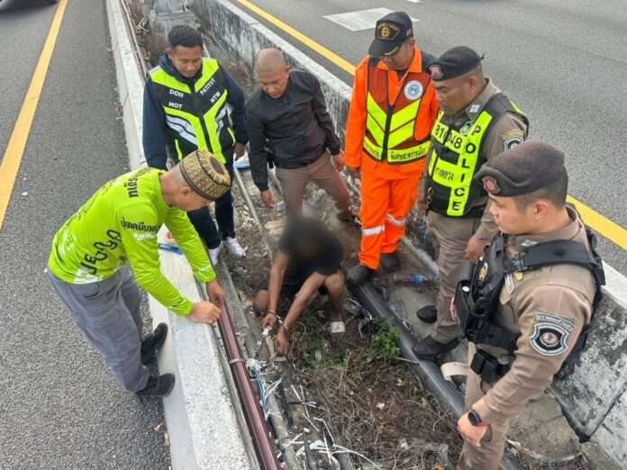 การจับกุมครั้งนี้สืบเนื่องจากเจ้าหน้าที่ได้รับแจ้งจากศูนย์ควบคุมจราจร CCB สุวรรณภูมิ ว่าพบบุคคลต้องสงสัยเป็นชายลักลอบเข้าไปในพื้นที่เกาะกลางถนน ช่วงกิโลเมตรที่ 8 ของทางด่วน M7 ก่อนตัดสายไฟของทางราชการ สร้างความเสี่ยงต่อระบบสาธารณูปโภคและความปลอดภัยของผู้ใช้เส้นทางเจ้าหน้าที่จึงรีบรุดเข้าตรวจสอบและวางกำลังดักสกัดใกล้จุดเกิดเหตุ ก่อนพบบุคคลต้องสงสัยเดินถือถุงสัมภาระท่าทางมีพิรุธ จึงแสดงตัวเข้าตรวจค้น พบของกลางซุกซ่อนอยู่ภายในถุง ประกอบด้วย รถจักรยานยนต์ฮอนด้า เวฟ 100 จำนวน 1 คัน ค้อนเหล็กตอกตะปู มีดทำครัว มีดคัตเตอร์ เทปกาว ประแจเบอร์ 10 และสายไฟที่ตัดมาแล้วความยาวประมาณ 15 เมตร จึงควบคุมตัวไว้ได้ทันที