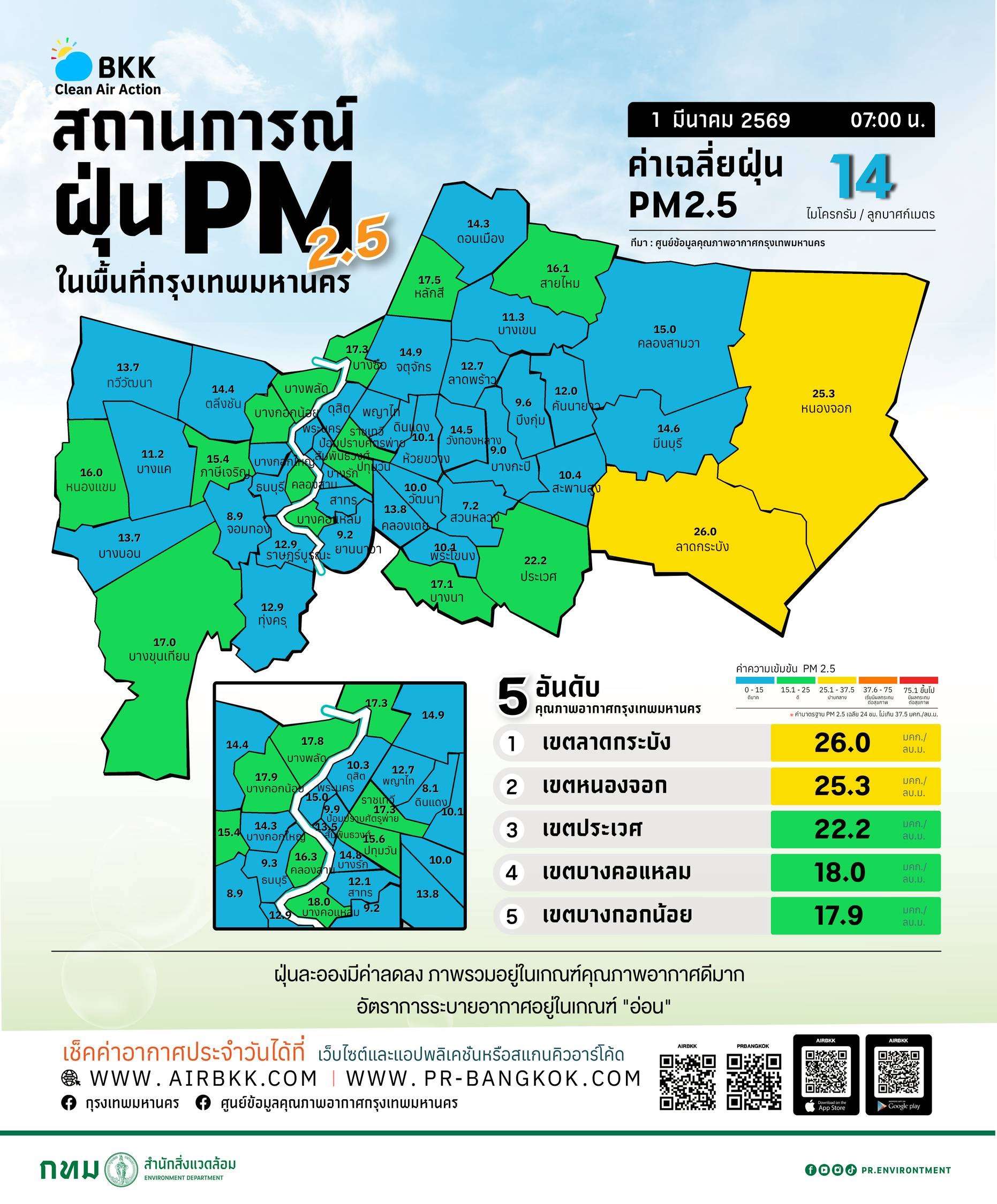 ศูนย์ข้อมูลคุณภาพอากาศกรุงเทพมหานคร รายงานผลการตรวจวัดฝุ่นละอองขนาดเล็ก PM2.5 ประจำวันที่ 1 มีนาคม 2569 ช่วงเวลา 05.00–07.00 น. พบว่า คุณภาพอากาศโดยรวมอยู่ในระดับดี และไม่เกินค่ามาตรฐานทุกพื้นที่ที่มีการตรวจวัด