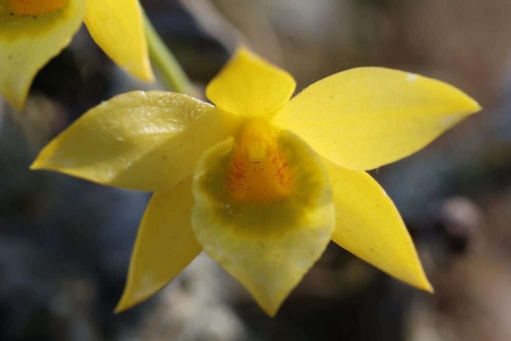 เอื้องชะนีเป็นกล้วยไม้ป่าที่มักออกดอกระหว่างเดือนกุมภาพันธ์ถึงมีนาคม ดอกสีเหลืองสดใสโดดเด่นท่ามกลางสีเขียวของผืนป่า ลักษณะลำต้นเรียวยาวและมีขนอ่อนคล้ายมือของชะนี ซึ่งเป็นที่มาของชื่อ เมื่อถึงช่วงออกดอก ใบจะร่วงหล่น เปิดทางให้ช่อดอกสีทองเปล่งประกายอย่างเต็มที่