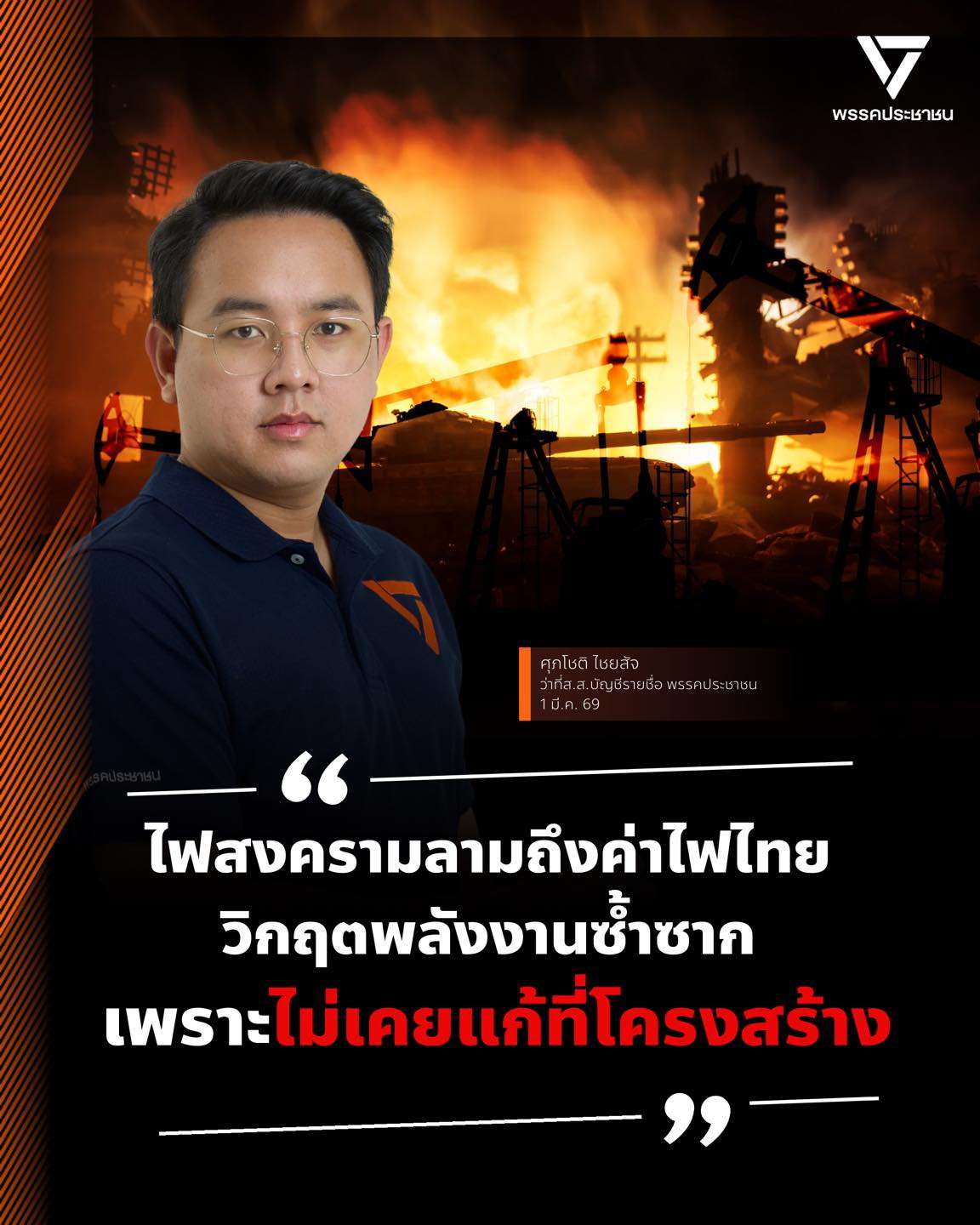 กรุงเทพฯ, วันที่ 2 มี.ค. – จากกรณีการโจมตีประเทศอิหร่าน โดยกองกำลังจากประเทศสหรัฐอเมริกา และอิสราเอล สร้างความตึงเครียดให้เกิดขึ้นทั้งในภูมิภาคตะวันออกกลาง และทั่วโลก โดยเฉพาะความกังวลว่าอาจจะเกิดสงครามลุกลามบานปลาย โดยวิกฤติที่จะเกิดขึ้นในระยะอันใกล้คือวิกฤติด้านพลังงาน ศุภโชติ ไชยสัจ ว่าที่ สส.บัญชีรายชื่อพรรคประชาชน (ปชน.) กล่าวว่า สถานการณ์การสู้รบอาจดูเหมือนไกลตัว แต่ในความเป็นจริงกำลังจะกระทบค่าครองชีพของพี่น้องประชาชนไทยโดยตรง โดยเฉพาะการนำเข้าน้ำมันและก๊าซธรรมชาติ ซึ่งเชื่อมโยงกับตลาดพลังงานโลกอย่างหลีกเลี่ยงไม่ได้ ราคาน้ำมันและก๊าซที่พุ่งสูงขึ้นกำลังกดดันต้นทุนพลังงานอีกระลอก