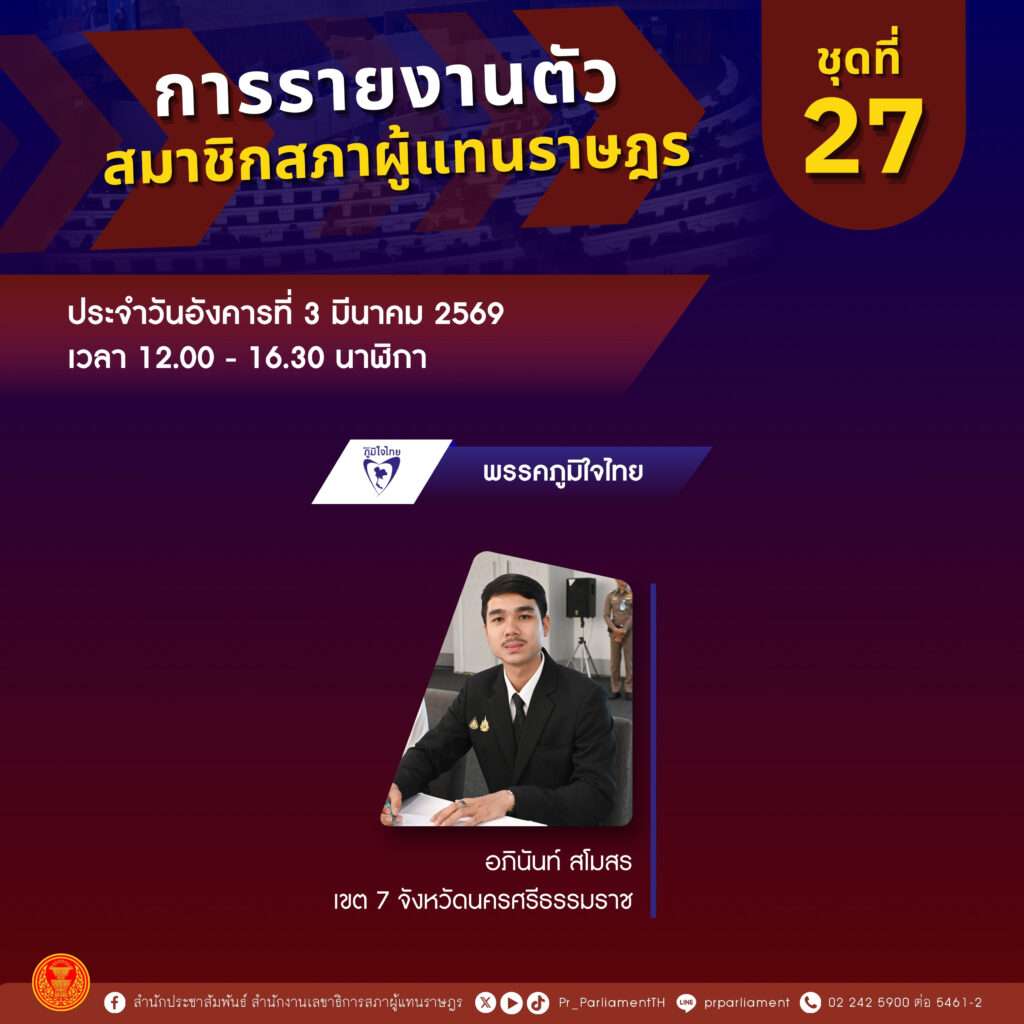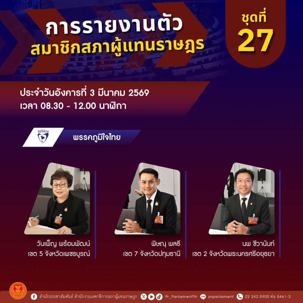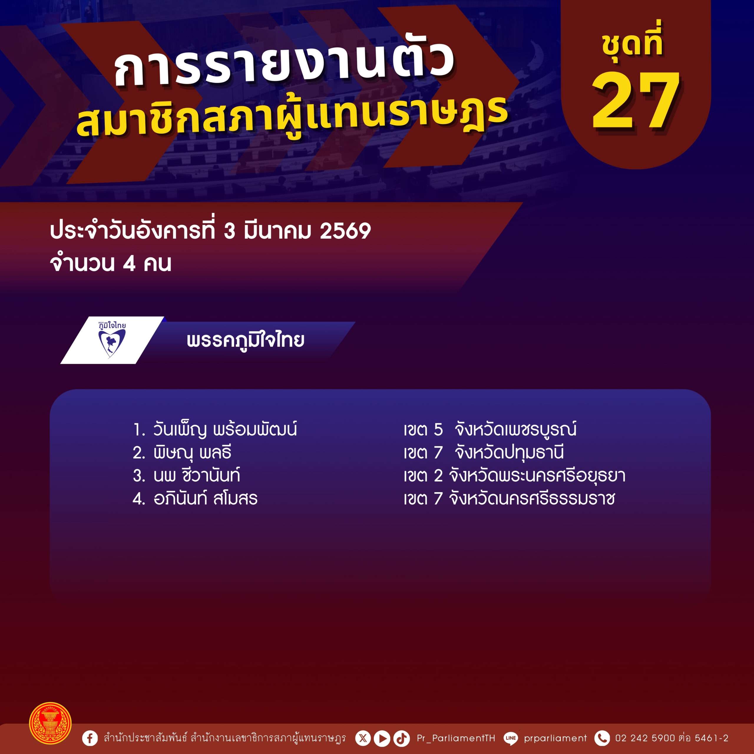 วันอังคารที่ 3 มีนาคม 2569 เวลา 08.30 – 16.30 นาฬิกา ณ บริเวณโถง ชั้น B1 อาคารรัฐสภา สำนักงานเลขาธิการสภาผู้แทนราษฎร เปิดรับรายงานตัว สมาชิกสภาผู้แทนราษฎร ชุดที่ 27 เป็นวันที่หก ภายหลังคณะกรรมการการเลือกตั้งประกาศรับรองผลการเลือกตั้ง โดยมี สมาชิกสภาผู้แทนราษฎร พรรคภูมิใจไทย มารายงานตัว จำนวน 4 คน ได้แก่ นางวันเพ็ญ พร้อมพัฒน์ สส.เพชรบูรณ์ เขต 5 นายพิษณุ พลธี สส.ปทุมธานี เขต 7 นายนพ ชีวานันท์ สส.พระนครศรีอยุธยา เขต 2 นายอภินันท์ สโมสร สส.นครศรีธรรมราช เขต 7