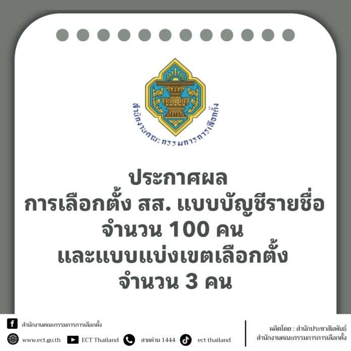 กรุงเทพฯ, วันที่ 4 มี.ค. – สำนักงานคณะกรรมการการเลือกตั้ง (กกต.) ประกาศรับรอง สส. แบบบัญชีรายชื่อทั้ง 100 คน และ สส. แบบแบ่งเขตเพิ่มเติม อีก 3 เขต ประกอบด้วย จ.พะเยา เขตเลือกตั้งที่ 1 นายอัครา พรหมเผ่า พรรคกล้าธรรม จ.จันทบุรี เขตเลือกตั้งที่ 1 พล.ต.ท.สุรพล วิรัตน์โยสินทร์ พรรคภูมิใจไทย และ จ.จันทบุรี เขตเลือกตั้งที่ 2 นายคัมภีร์ ชื่นบาน พรรคภูมิใจไทย