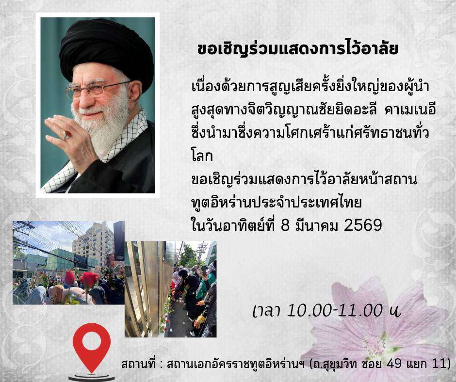 สถานทูตอิหร่านประจำประเทศไทย เปิดให้ลงนามไว้อาลัยอดีตผู้นำสูงสุด