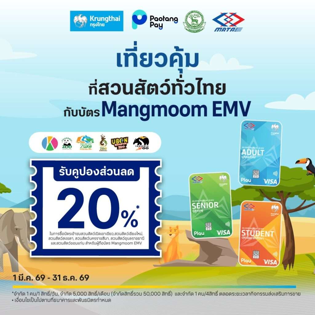 การรถไฟฟ้าขนส่งมวลชนแห่งประเทศไทย (รฟม.) ร่วมกับ องค์การสวนสัตว์แห่งประเทศไทย ในพระบรมราชูปถัมภ์ (อสส.) ส่งเสริมการท่องเที่ยวเชิงอนุรักษ์ มอบสิทธิพิเศษส่วนลด 20% ค่าเข้าชมสวนสัตว์ภายใต้ความรับผิดชอบของ อสส. สำหรับผู้ใช้บริการรถไฟฟ้า MRT ทุกสายที่ถือบัตร Mangmoom EMV ตั้งแต่วันนี้ – 31 ธันวาคม 2569