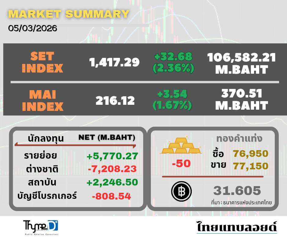 SET ปิดวันนี้ที่ 1,417.29 จุด เพิ่มขึ้น 32.68 จุด (+2.36%) มูลค่าซื้อขาย 106,582.21 ล้านบาท