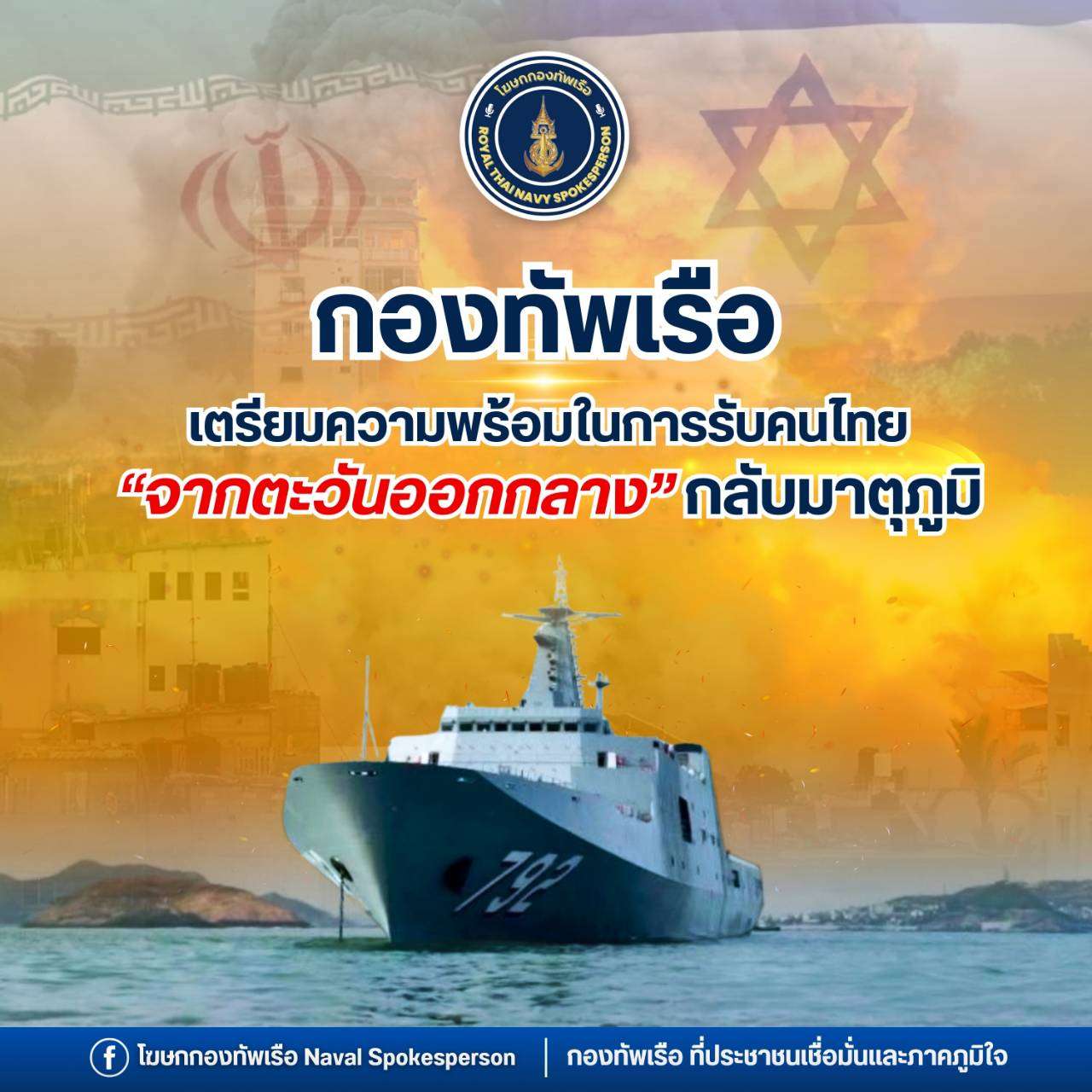 พลเรือตรี ปารัช รัตนไชยพันธ์ โฆษกกองทัพเรือ เปิดเผยว่า จากสถานการณ์ความตึงเครียดและการสู้รบในภูมิภาคตะวันออกกลาง ซึ่งอาจส่งผลกระทบต่อความปลอดภัยของประชาชนคนไทยในพื้นที่ กองทัพเรือได้ติดตามสถานการณ์อย่างใกล้ชิด และเตรียมความพร้อมกำลังทางเรือเพื่อรองรับภารกิจช่วยเหลือและอพยพคนไทยออกจากพื้นที่เสี่ยงภัยตามนโยบายของรัฐบาล