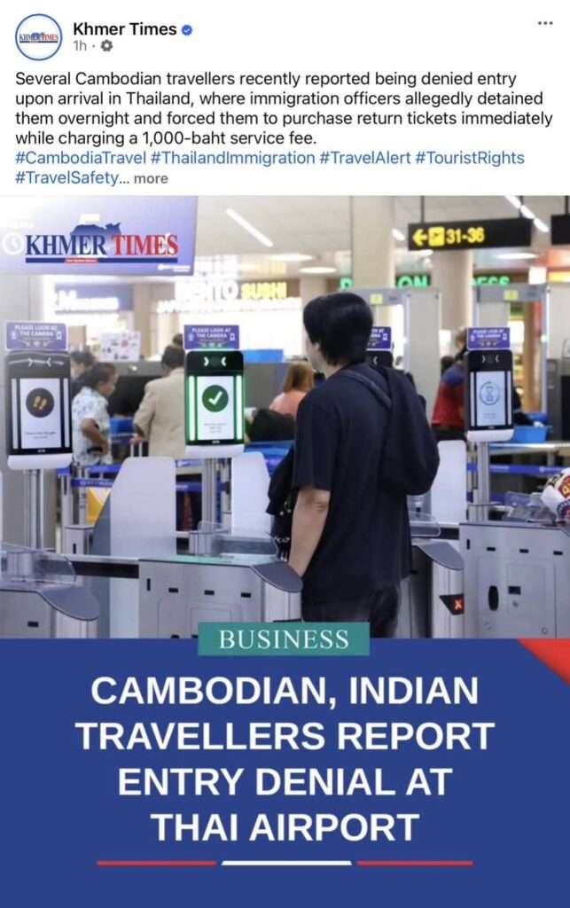 ตม.ไทย โต้สื่อเขมร อ้างเข้มตรวจเขมร เรียกเก็บค่าธรรมเนียม ยันใช้มาตรฐานสากลตามที่สื่อ Khmer Times เพจของกัมพูชา เผยแพร่ข่าวเป็นภาษาอังกฤษกล่าวอ้างว่า นักท่องเที่ยวชาวกัมพูชาและชาวอินเดียถูกปฏิเสธการเข้าเมืองที่ท่าอากาศยานในประเทศไทย แถมถูกบังคับให้จองตั๋วกลับโดยด่วน พร้อมถูกเรียกเก็บค่าบริการ 1,000 บาท จนอาจสร้างความเข้าใจผิดต่อนักท่องเที่ยวต่างชาติที่เข้ามาเที่ยวประเทศไทย นั้น