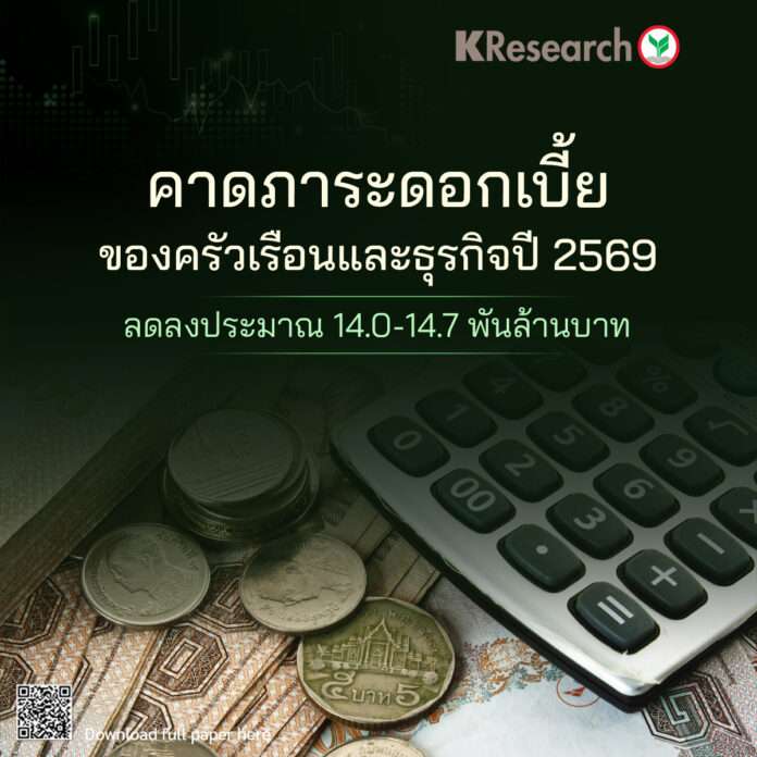 ในปี 2569 ลูกหนี้จะได้ประโยชน์มากขึ้นจากดอกเบี้ยที่ปรับลด เพราะมีทั้งผลของการลดดอกเบี้ยช่วงปลายปี 2568 ซึ่งเริ่มบรรเทาภาระดอกเบี้ยให้ลูกหนี้ในช่วงต้นปีนี้ และการลดดอกเบี้ยเพิ่มเติมในช่วงก.พ.–มี.ค. 2569 ซึ่งจะทยอยมีผลในช่วงที่เหลือของปี โดยศูนย์วิจัยกสิกรไทย คาดว่า ประมาณ 71% ของยอดคงค้างสินเชื่อรายย่อยและธุรกิจจะได้รับอานิสงส์จากการปรับลดดอกเบี้ยภายในปี 2569 นี้ ซึ่งส่งผลให้ภาระดอกเบี้ยของลูกหนี้ลดลงรวมกันประมาณ 14,000–14,700 ล้านบาท