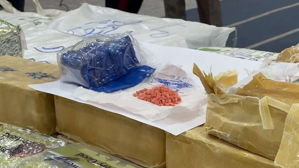 จากการตรวจค้นภายในบ้านพัก พบยาเสพติดจำนวนมากบรรจุในกระสอบสีขาววางอยู่บริเวณชั้นล่างของบ้าน ประกอบด้วย​ คีตามีน น้ำหนักรวม 750 กิโลกรัม, ไอซ์ น้ำหนักรวม 665 กิโลกรัมและยาบ้า จำนวน 1,000,000 เม็ดรวมของกลางยาเสพติดน้ำหนักกว่า 1,415 กิโลกรัม พร้อมตรวจยึดรถยนต์ 2 คัน โทรศัพท์มือถือ 2 เครื่อง ซึ่งเชื่อว่าใช้ในการติดต่อสื่อสารและขนลำเลียงยาเสพติด