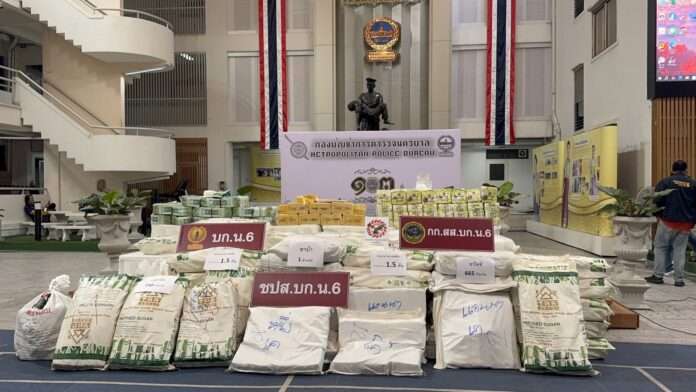 ตำรวจสืบสวนนครบาล 6 สนธิกำลังหน่วยข่าวกรองทางทหาร กองทัพบก เปิดปฏิบัติการทลายแหล่งพักยาเสพติดรายใหญ่ในพื้นที่ อ.กำแพงแสน จ.นครปฐม จับกุมผู้ต้องหาได้ 3 ราย พร้อมของกลางยาเสพติดจำนวนมหาศาล รวมกว่า 1.4 ตัน และยาบ้าอีก 1 ล้านเม็ด เตรียมกระจายสู่เครือข่ายในพื้นที่ชั้นใน