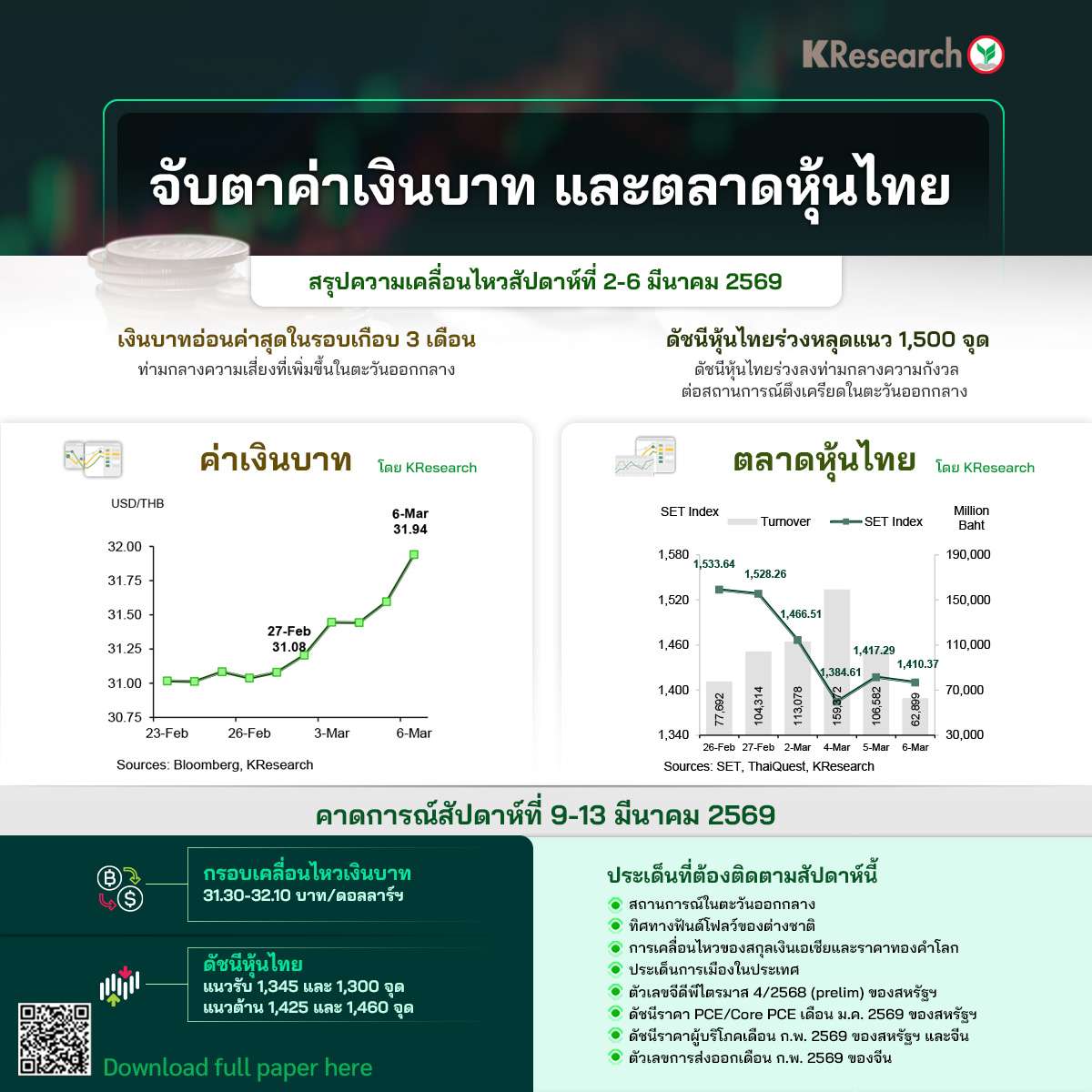 กรุงเทพฯ วันที่ 7 มี.ค. – ศูนย์วิจัยกสิกรวิเคราะห์สถานการณ์ค่าเงินบาท และตลาดหุ้นไทย โดยระบุว่าสัปดาห์ที่ผ่านมา (2 – 6 มี.ค.) เงินบาทอ่อนค่าสุดในรอบเกือบ 3 เดือนท่ามกลางความเสี่ยงที่เพิ่มขึ้นในตะวันออกกลาง ขณะที่ ดัชนีหุ้นไทยร่วงหลุดแนว 1,500 จุด ท่ามกลางความกังวลต่อสถานการณ์ตึงเครียดในตะวันออกกลาง