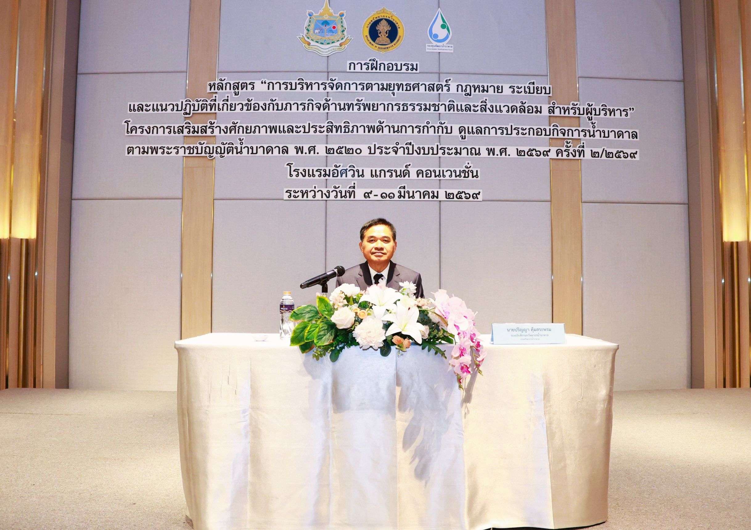 กรุงเทพฯ, วันที่ 10 มีนาคม – นายภาดล ถาวรกฤชรัตน์ อธิบดีกรมทรัพยากรน้ำบาดาล มอบหมายให้นายปริญญา คุ้มสระพรม รองอธิบดี เป็นประธานเปิดการฝึกอบรม หลักสูตร “การบริหารจัดการตามยุทธศาสตร์ กฎหมาย ระเบียบ และแนวปฏิบัติที่เกี่ยวข้องกับภารกิจด้านทรัพยากรธรรมชาติและสิ่งแวดล้อม สำหรับผู้บริหาร” โดยมีนางสาวพิมพ์ชนก ภู่ประดับ ผู้อำนวยการสำนักควบคุมกิจการน้ำบาดาล กล่าวรายงาน และมีนายสยาม ช้างเนียม ผู้ช่วยปลัดกระทรวงทรัพยากรธรรมชาติและสิ่งแวดล้อม ที่ปรึกษากรมทรัพยากรน้ำบาดาล ร่วมพิธี โดยหลักสูตรนี้จัดขึ้นระหว่างวันที่ 9 – 11 มีนาคม 2569 ณ โรงแรมอัศวิน แกรนด์ คอนเวนชั่น กรุงเทพมหานคร มีผู้เข้าร่วมฝึกอบรมมีจำนวนทั้งสิ้น 110 ราย จากทั่วประเทศ