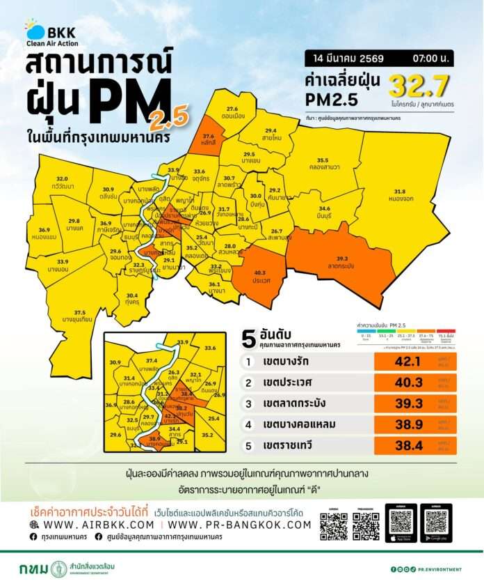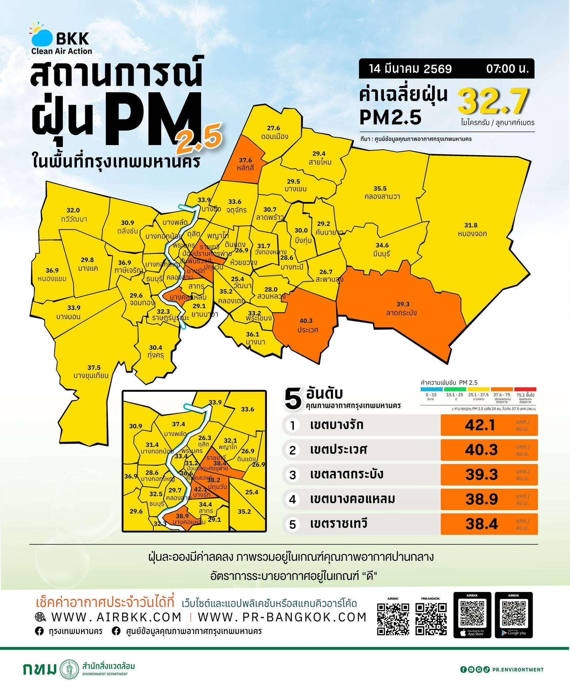 ศูนย์ข้อมูลคุณภาพอากาศกรุงเทพมหานคร รายงานสถานการณ์ฝุ่นละอองขนาดเล็ก PM2.5 ในพื้นที่กรุงเทพมหานคร ประจำวันที่ 14 มีนาคม 2569 เวลา 07.00 น. พบว่า ค่าเฉลี่ยฝุ่นละอองอยู่ที่ 32.7 ไมโครกรัมต่อลูกบาศก์เมตร ยังไม่เกินค่ามาตรฐานที่กำหนดไว้ 37.5 ไมโครกรัมต่อลูกบาศก์เมตร โดยภาพรวมคุณภาพอากาศอยู่ในระดับ ปานกลาง (สีเหลือง) และมีแนวโน้มลดลง