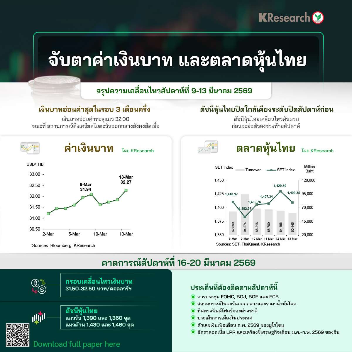 กรุงเทพฯ วันที่ 14 มี.ค. – ศูนย์วิจัยกสิกรวิเคราะห์สถานการณ์ค่าเงินบาท และตลาดหุ้นไทย โดยระบุว่าสัปดาห์ที่ผ่านมา (9-13 มี.ค.) เงินบาทอ่อนค่าสุดในรอบ 3 เดือนครึ่ง โดยอ่อนค่าทะลุแนว 32.00 ขณะที่ สถานการณ์ตึงเครียดในตะวันออกกลางยังคงยืดเยื้อ ส่วนดัชนีหุ้นไทยปิดใกล้เคียงระดับปิดสัปดาห์ก่อน โดยเคลื่อนไหวผันผวน ก่อนจะย่อตัวลงช่วงท้ายสัปดาห์