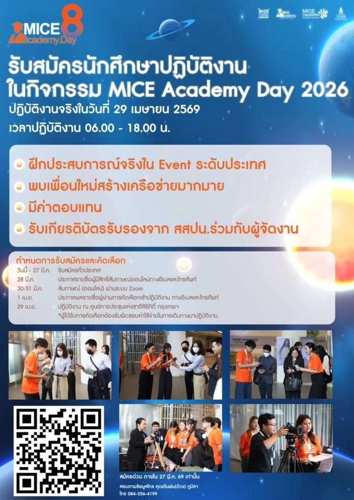 กรุงเทพฯ, วันที่ 14 มี.ค. – สำนักงานส่งเสริมการจัดประชุมและนิทรรศการ (องค์การมหาชน) หรือ ทีเส็บ ประกาศเปิดรับสมัครนักศึกษาที่สนใจด้านการจัดงานอีเวนต์ การประชุม และนิทรรศการ เข้าร่วมเป็นส่วนหนึ่งของทีมปฏิบัติงานในกิจกรรม MICE Academy Day 2026 ในวันพุธที่ 29 เมษายน 2569 ที่ศูนย์การประชุมแห่งชาติ สิริกิติ์ กรุงเทพ พร้อมพัฒนาทักษะการทำงานร่วมกับทีมงานมืออาชีพในบรรยากาศของงานอีเวนต์จริง