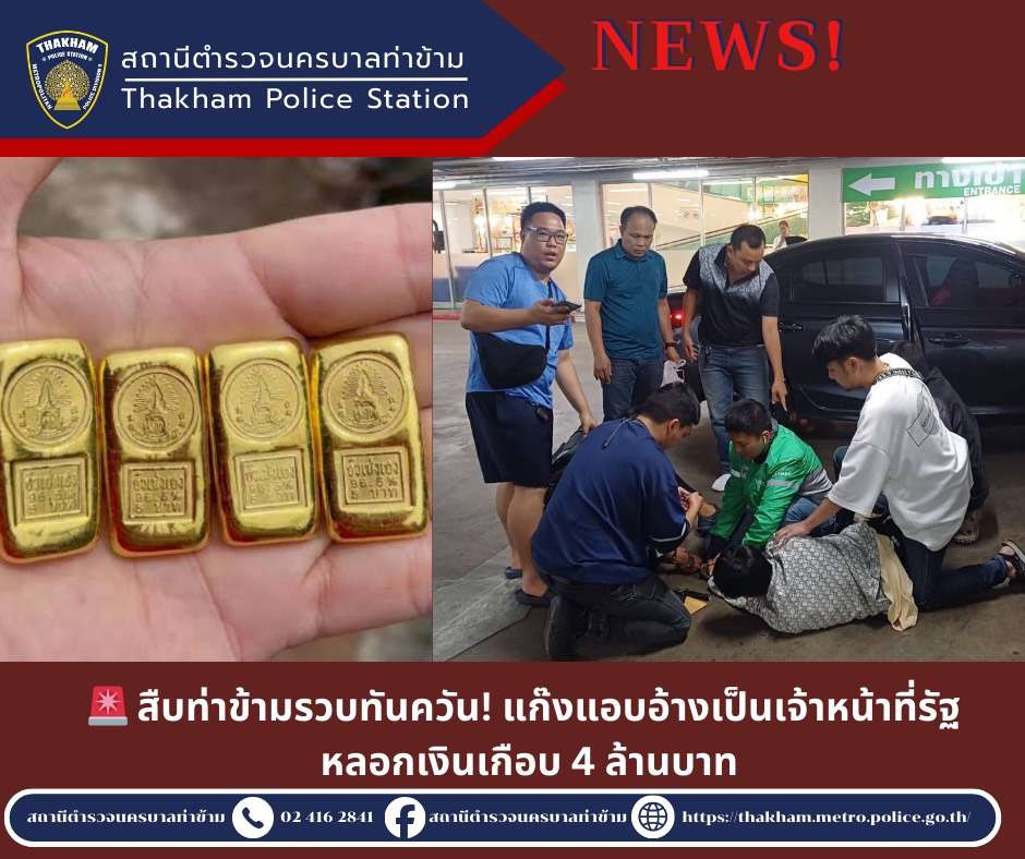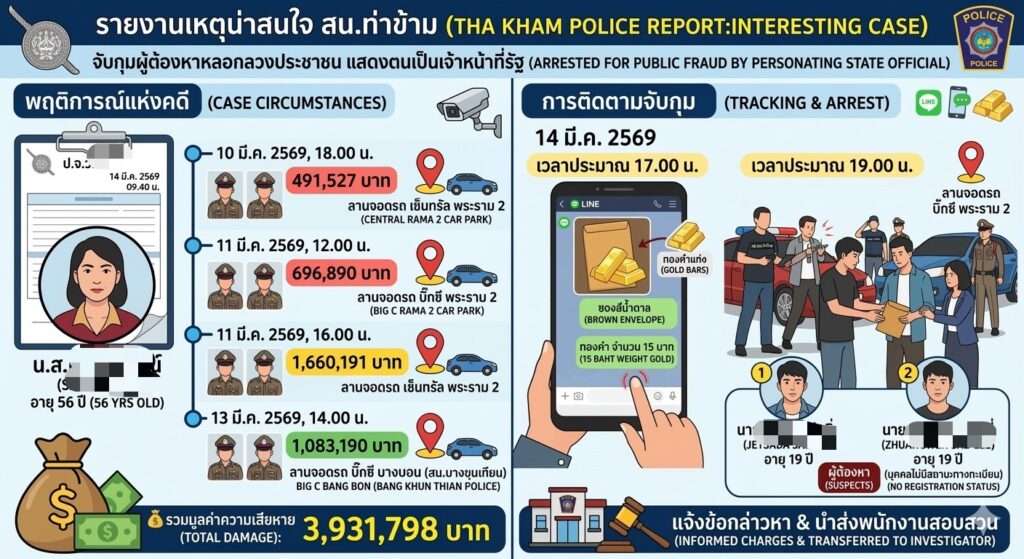 เมื่อวันที่ 14 มีนาคม 2569 เวลา 19.00 น. เจ้าหน้าที่ฝ่ายสืบสวนสถานีตำรวจนครบาลท่าข้าม สามารถจับกุมผู้ต้องหา 2 ราย ในคดีร่วมกันหลอกลวงประชาชน โดยแอบอ้างเป็นเจ้าหน้าที่ของรัฐ หลอกให้ผู้เสียหายโอนเงินและส่งมอบทรัพย์สิน รวมมูลค่าความเสียหาย 3,931,798 บาท