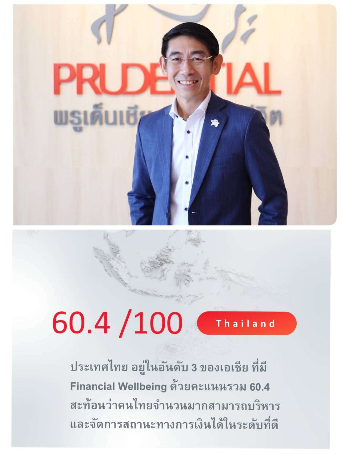 กลุ่มบริษัทพรูเด็นเชียล (Prudential plc) เผยผลวิจัยล่าสุดเกี่ยวกับ “ความเป็นอยู่ที่ดีทางการเงิน” (Financial Wellbeing) พบว่า ประเทศไทยอยู่ในอันดับ 3 ของภูมิภาคเอเชีย ด้วยคะแนน 60.4 จาก 100 รองจากเวียดนามและอินโดนีเซีย สะท้อนว่าคนไทยจำนวนมากสามารถบริหารจัดการสถานะทางการเงินในชีวิตประจำวันได้ในระดับที่ดี ไม่ว่าจะเป็นการควบคุมค่าใช้จ่าย การวางแผนการออม หรือการตัดสินใจทางการเงินเพื่อรักษาคุณภาพชีวิตในปัจจุบัน อย่างไรก็ตาม เมื่อพิจารณาในเชิงลึก จะพบ “ช่องว่างสำคัญ” ระหว่างอิสรภาพทางการเงินในปัจจุบัน อยู่ที่ 59.9 กับอิสรภาพทางการเงินในอนาคต อยู่ที่ 55.5 (ลดลงถึง 7%) ซึ่งเป็นหนึ่งในตลาดที่มีการปรับลดลงมากในภูมิภาค
