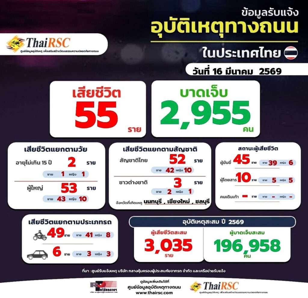 เมื่อวันที่ 17 มีนาคม 2568 ผู้สื่อข่าวไทยแทบลอยด์ รายงานว่าศูนย์ข้อมูลอุบัติเหตุทางถนน (ThaiRSC) เปิดเผยสถิติอุบัติเหตุบนท้องถนนของประเทศไทย ประจำวันที่ 16 มีนาคม 2569 พบว่าเกิดอุบัติเหตุรุนแรงทั่วประเทศ ส่งผลให้มีผู้เสียชีวิตรวม 55 ราย และมีผู้ได้รับบาดเจ็บสูงถึง 2,955 คน สะท้อนสถานการณ์ความสูญเสียบนท้องถนนที่ยังคงน่าเป็นห่วง
