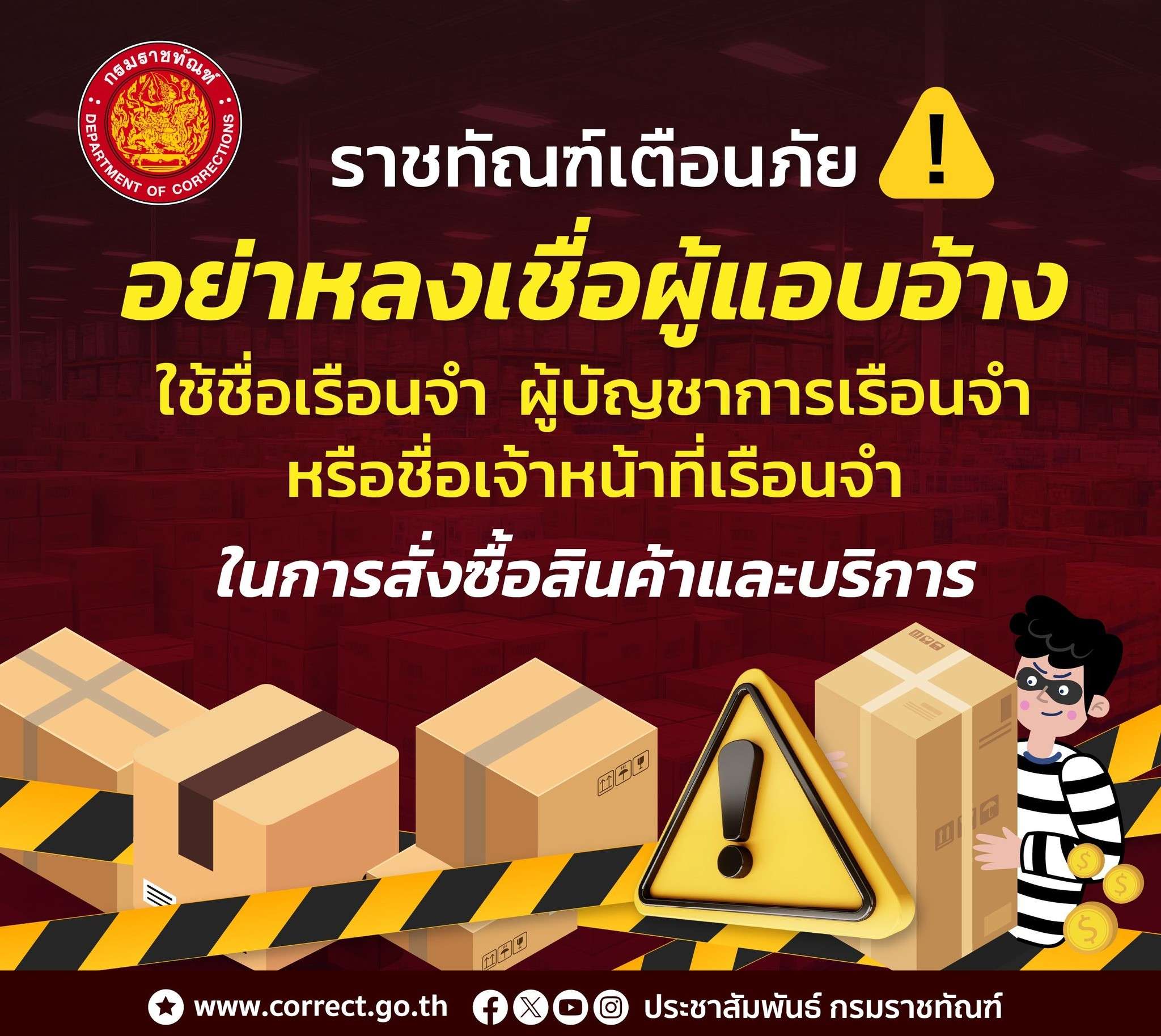 จึงขอประชาสัมพันธ์ให้ร้านค้า ผู้ประกอบการหรือประชาชนทั่วไปอย่าหลงเชื่อการติดต่อในลักษณะดังกล่าว และขอให้ตรวจสอบข้อเท็จจริงกับเรือนจำหรือหน่วยงานที่เกี่ยวข้องโดยตรงเท่านั้น ทั้งนี้ เรือนจำที่เกี่ยวข้องได้แจ้งความ ร้องทุกข์กับพนักงานสอบสวนเป็นหลักฐาน และได้ตั้งคณะกรรมการตรวจสอบข้อเท็จจริงแล้ว