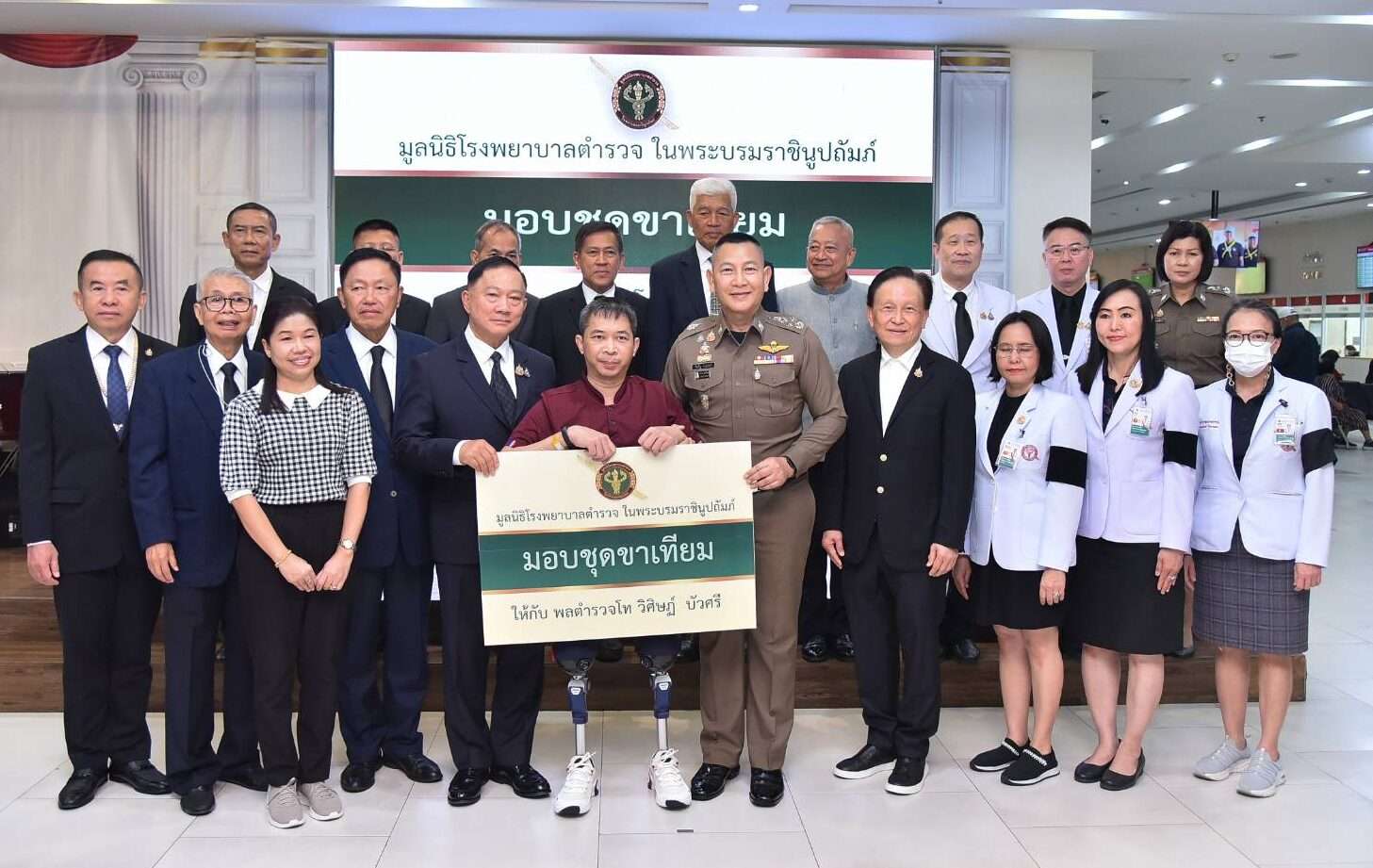 จากนั้นเวลา 09.30 น. พล.ต.อ.กิตติ์รัฐ พันธุ์เพ็ชร์ ผบ.ตร. ในฐานะประธานมูลนิธิโรงพยาบาลตำรวจ ในพระบรมราชินูปถัมภ์ ได้เป็นประธานพิธีมอบขาเทียมให้กับ พล.ต.ท.วิศิษฏ์ บัวศรี อดีตข้าราชการตำรวจชุด EOD กองกำกับการตำรวจตระเวนชายแดนที่ 43 ที่ได้รับบาดเจ็บสาหัสจากการปฏิบัติหน้าที่เหตุลอบวางระเบิดขณะลาดตระเวนเส้นทางรถไฟในภาคใต้ เมื่อเดือนกุมภาพันธ์ 2565 จนต้องตัดขา โดยมี พล.ต.อ.อดุลย์ แสงสิงแก้ว ประธานกรรมการมูลนิธิ พล.ต.อ.อดุลย์ แสงสิงแก้ว และ พล.ต.อ.วินัย ทองสอง นายกสมาคมตำรวจ ร่วมพิธี